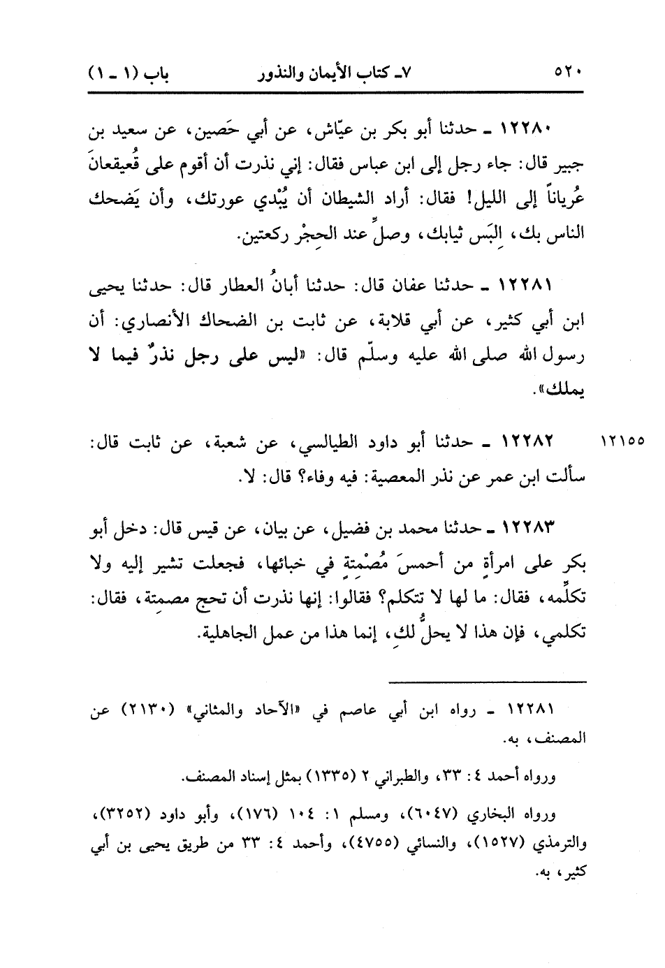 12281- حدَّثَنَا عَفَّانَ , قَالَ : حدَّثَنَا أَبَانُ الْعَطَّارُ , قَالَ : حدَّثَنَا يَحْيَى بْنُ أَبِي كَثِيرٍ ، عَنْ أَبِي قِلاَبَةَ ، عَنْ ثَابِتِ بْنِ الضَّحَّاكِ الأَنْصَارِيِّ ، أَنَّ رَسُولَ اللهِ صَلَّى الله عَلَيْهِ وَسَلَّمَ ، قَالَ : لَيْسَ عَلَى رَجُلٍ نَذْرٌ فِيمَا لاَ يَمْلِكُ.