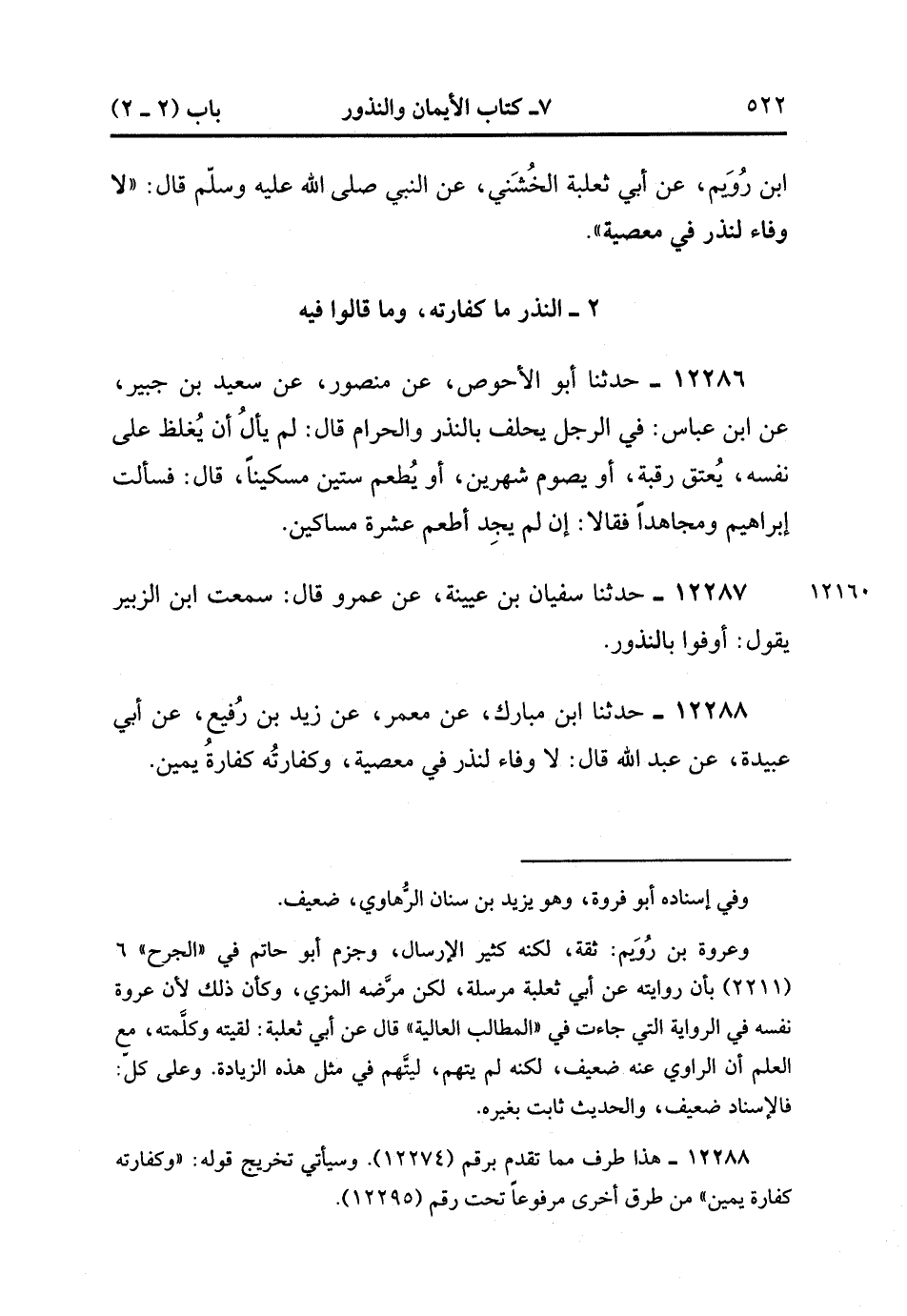 12288- حدَّثَنَا ابْنُ مُبَارَكٍ ، عَنْ مَعْمَرٍ ، عَنْ زَيْدِ بْنِ رُفَيْعٍ ، عَنْ أَبِي عُبَيْدَةَ ، عَنْ عَبْدِ اللهِ ، قَالَ : لاَ وَفَاءَ لِنَذْرٍ فِي مَعْصِيَةِ اللهِ ، وَكَفَّارَتُهُ كَفَّارَةُ يَمِينٍ. (4/4:1).