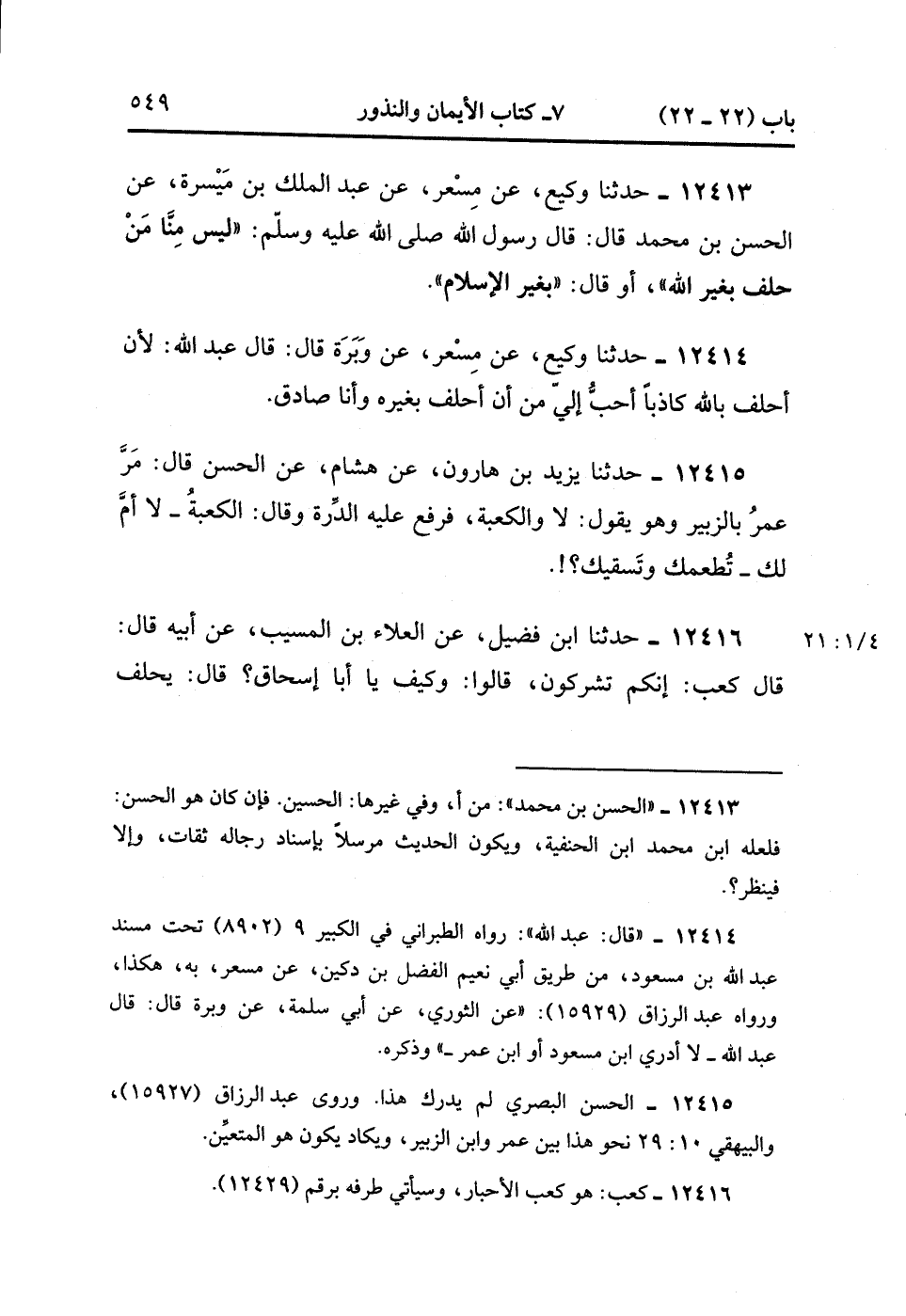 12416- حدَّثَنَا ابْنُ فُضَيْلٍ ، عَنِ الْعَلاَءِ بْنِ الْمُسَيَّبِ ، عَنْ أَبِيهِ ، قَالَ : قَالَ كَعْبٌ : إنَّكُمْ تُشْرِكُونَ ، قَالُوا : وَكَيْفَ يَا أَبَا إِسْحَاقَ ؟ قَالَ : يَحْلِف الرَّجُلُ لاَ وَأَبِي ، لاَ وَأَبِيك ، لاَ لَعَمْرِي ، لاَ وَحَيَاتِكَ ، لاَ وَحُرْمَةِ الْمَسْجِدِ ، لاَ وَالإِسْلاَمِ ، وَأَشْبَاهِهِ مِنَ الْقَوْلِ. (4/21:1).