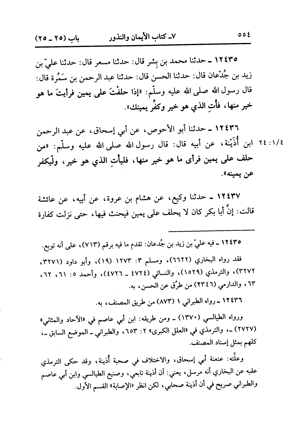 12437- حدَّثَنَا وَكِيعٌ ، عَنْ هِشَامِ بْنِ عُرْوَةَ ، عَنْ أَبِيهِ ، عَنْ عَائِشَةَ رضي اللَّهُ عَنْهَا ، قَالَتْ : إنَّ أَبَا بَكْرٍ كَانَ لاَ يَحْلِفُ عَلَى يَمِينٍ فَيَحْنَثُ فِيهَا ، حَتَّى نَزَلَتْ كَفَّارَةُ الْيَمِينِ ، قَالَ : لاَ أَحْلِفُ عَلَى يَمِينٍ فَأَرَى غَيْرَهَا خَيْرًا مِنْهَا إلاَّ أَتَيْتُ الَّذِي هُوَ خَيْرٌ , وَكَفَّرْت يَمِينِي. (4/24:1).