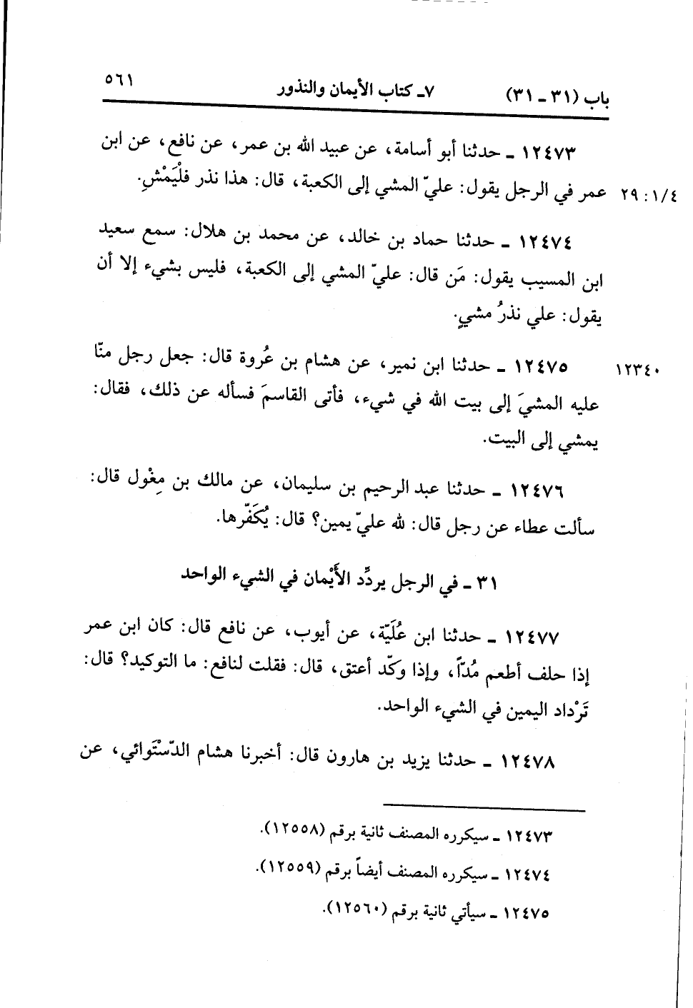 12474- حدَّثَنَا حَمَّادُ بْنُ خَالِدٍ ، عَنْ محمد بْنِ هِلاَلٍ سَمِعَ سَعِيدَ بْنَ الْمُسَيَّبِ يَقُولُ : مَنْ قَالَ عَلَيَّ الْمَشْيُ إلَى الْكَعْبَةِ ، فَلَيْسَ بِشَيْءٍ إلاَّ أَنْ يَقُولَ : عَلَيَّ نَذْرُ مَشْيٍ.