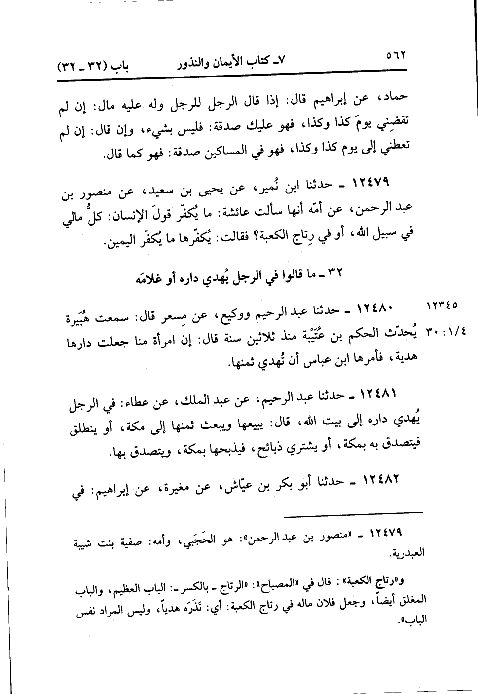 12479- حدَّثَنَا ابْنُ نُمَيْرٍ ، عَنْ يَحْيَى بْنِ سَعِيدٍ ، عَنْ مَنْصُورٍ بن عَبْدِ الرَّحْمَنِ ، عَنْ أُمِّهِ ، أَنَّهَا سَأَلَتْ عَائِشَةَ رضي اللَّهُ عَنْهُا مَا يُكَفِّرُ قَوْلَ الإِنْسَاْن : كُلُّ مَالِي فِي سَبِيلِ اللهِ ، أَوْ فِي رتَاجِ الْكَعْبَةِ ، فَقَالَتْ : يُكَفِّرُهَا مَا يُكَفِّرُ الْيَمِينَ. (4/29:1)