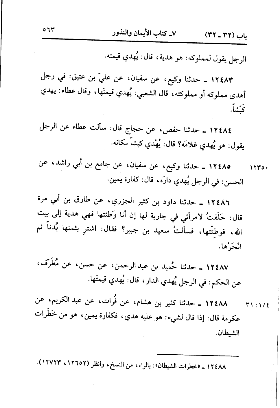 12488- حدَّثَنَا كثير بْنُ هِشَامٍ ، عَنْ فُرَات ، عَنْ عَبْدِ الْكَرِيمِ ، عَنْ عِكْرِمَةَ ، قَالَ إذَا قَالَ لِشَيْءٍ : هُوَ عَلَيْهِ هَدْيٌ ، فَكَفَّارَةُ يَمِينٍ هُوَ مِنْ خَطَرَاتِ الشَّيْطَانِ. (4/31:1).