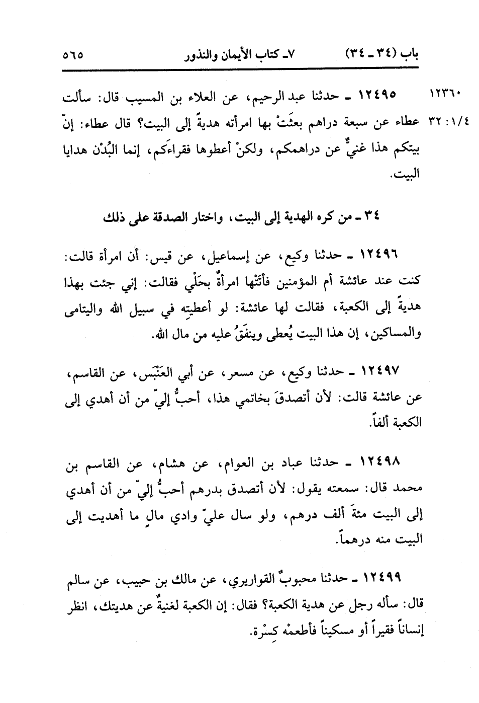 12499- حدَّثَنَا مَحْبُوبٌ الْقَوَارِيرِيُّ ، عَنْ مَالِكٍ بنِ حَبِيبٍ ، عَنْ سَالِمٍ ، قَالَ : سَأَلَهُ رَجُلٌ عَنْ هَدِيَّةِ الْكَعْبَةِ ، فَقَالَ : إنَّ الْكَعْبَةَ لَغَنِيَّةٌ عَنْ هَدِيَّتِكَ ، أُنْظُر إنْسَانًا فَقِيرًا أَو مِسْكِينًا فَأَطعِمه كِسرَة. (4/32:1).