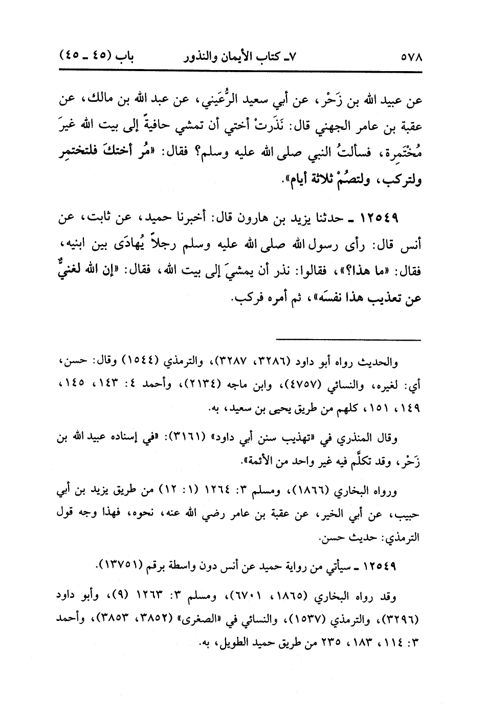 12549- حدَّثَنَا يَزِيدُ بْنُ هَارُونَ , قَالَ : أَخْبَرَنَا حُمَيْدٌ ، عَنْ ثَابِتٍ ، عَنْ أَنَسٍ ، قَالَ رَأَى رَسُولُ اللهِ صَلَّى الله عَلَيْهِ وَسَلَّمَ رَجُلاً يُهَادَى بَيْنَ ابْنَيْهِ ، فَقَالَ : مَا هَذَا ؟ فَقَالُوا : نَذَرَ أَنْ يَمْشِيَ إلَى بَيْتِ اللهِ ، فَقَالَ : إنَّ اللَّهَ لَغَنِيٌّ ، عَنْ تَعْذِيبِ هَذَا نَفْسَهُ ، ثُمَّ أَمَرَهُ فَرَكِبَ. (4/39:1).