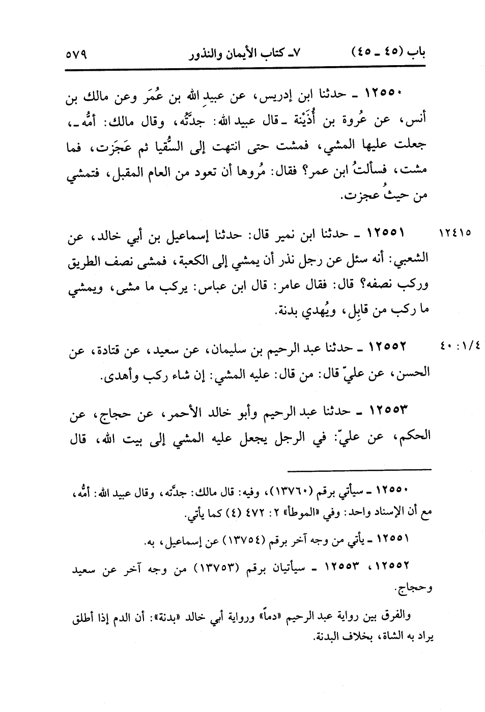 12553- حدَّثَنَا عَبْدُ الرَّحِيمِ ، وَأَبُو خَالِدٍ الأَحْمَرِِ ، عَنْ حَجَّاجٍ ، عَنِ الْحَكَمِ ، عَنْ عَلِيٍّ ؛ فِي الرَّجُلِ يَجْعَلُ عَلَيْهِ الْمَشْيَ إلَى بَيْتِ اللهِ ، قَالَ عَبْدُ الرَّحِيمِ : يَرْكَبُ وَيُهْرِيقُ دَمًا ، وَقَالَ : أَبُو خَالِدٍ : يُهْدِي بَدَنَةً. (4/40:1).