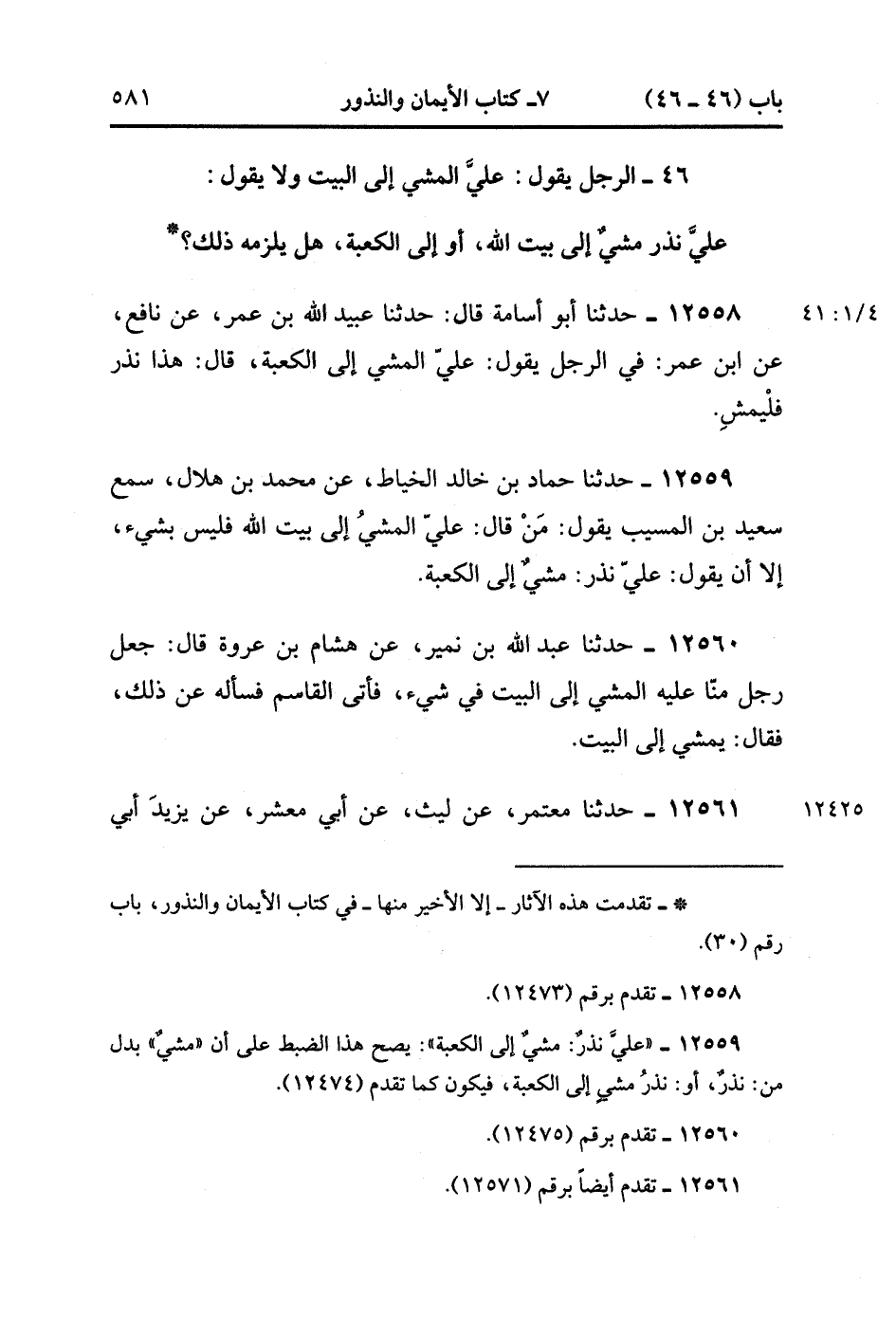 12558- حدَّثَنَا أبُو أُسَامَةَ , قَالَ : حدَّثَنَا عُبَيْدُ اللهِ بْنُ عُمَرَ ، عَنْ نَافِعٍ ، عَنِ ابْنِ عُمَرَ ؛ فِي الرَّجُلِ يَقُولُ عَلَيَّ الْمَشْيُ إلَى الْكَعْبَةِ ، قَالَ : هَذَا نَذْرٌ ، فَلْيَمْشِ.