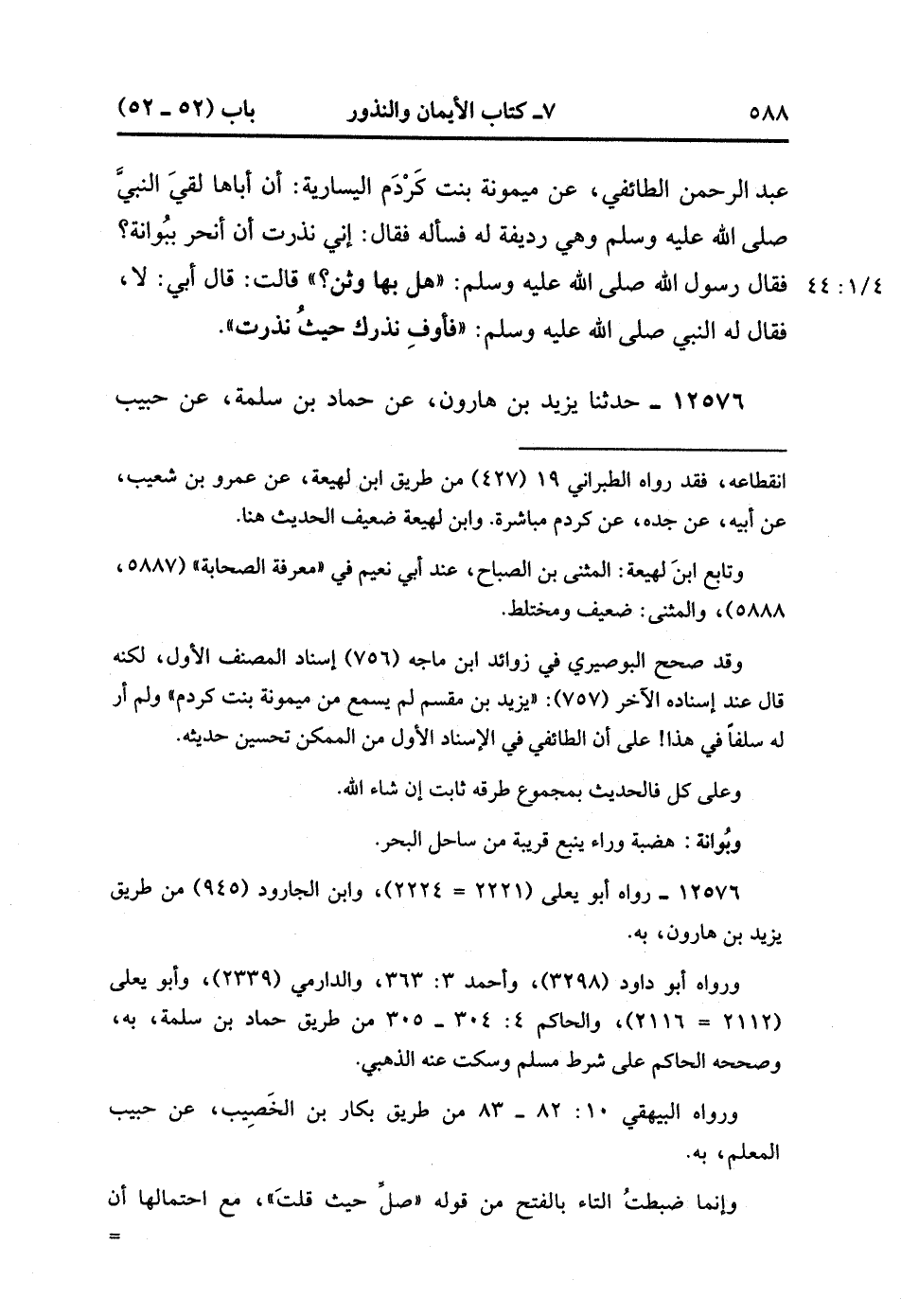 12576- حدَّثَنَا يَزِيدُ بْنُ هَارُونَ ، عَنْ حَمَّادِ بْنِ سَلَمَةَ ، عَنْ حَبِيبٍ الْمُعَلِّمِ ، عَنْ عَطَاءٍ ، عَنْ جَابِرٍ ، أَنَّ رَجُلاً نَذَرَ أَنْ يُصَلِّيَ فِي بَيْتِ الْمَقْدِسِ ، فَسَأَلَ عَنْ ذَلِكَ رَسُولَ اللهِ صَلَّى الله عَلَيْهِ وَسَلَّمَ ، فَقَالَ لَهُ رَسُولَ اللهِ صَلَّى الله عَلَيْهِ وَسَلَّمَ صَلِّ هُنَا , يَعْنِي فِي الْمَسْجِدِ الْحَرَامِ ، فَأَعَادَ عَلَيْهِ ثَلاَثًا ، فَقَالَ : صَلِّ حَيْثُ قلت. (4/44:1).
