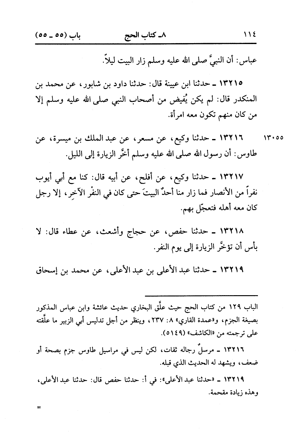 13219- حدَّثَنَا عَبْدُ الأَعْلَى بْنُ عَبْدِ الأَعْلَى ، عَنْ مُحَمَّدِ بْنِ إِسْحَاقَ ، قَالَ : رَأَيْتُ الْقَاسِمَ بْنَ مُحَمَّدٍ بِمِنًى مُعْتَمّاً مُتَقَمِّصًا ، وَكَانَ لاَ يُفِيضُ حَتَّى يَنْفِرَ فِي آخِرِ أَيَّامِ التَّشْرِيقِ. (4/137:1).