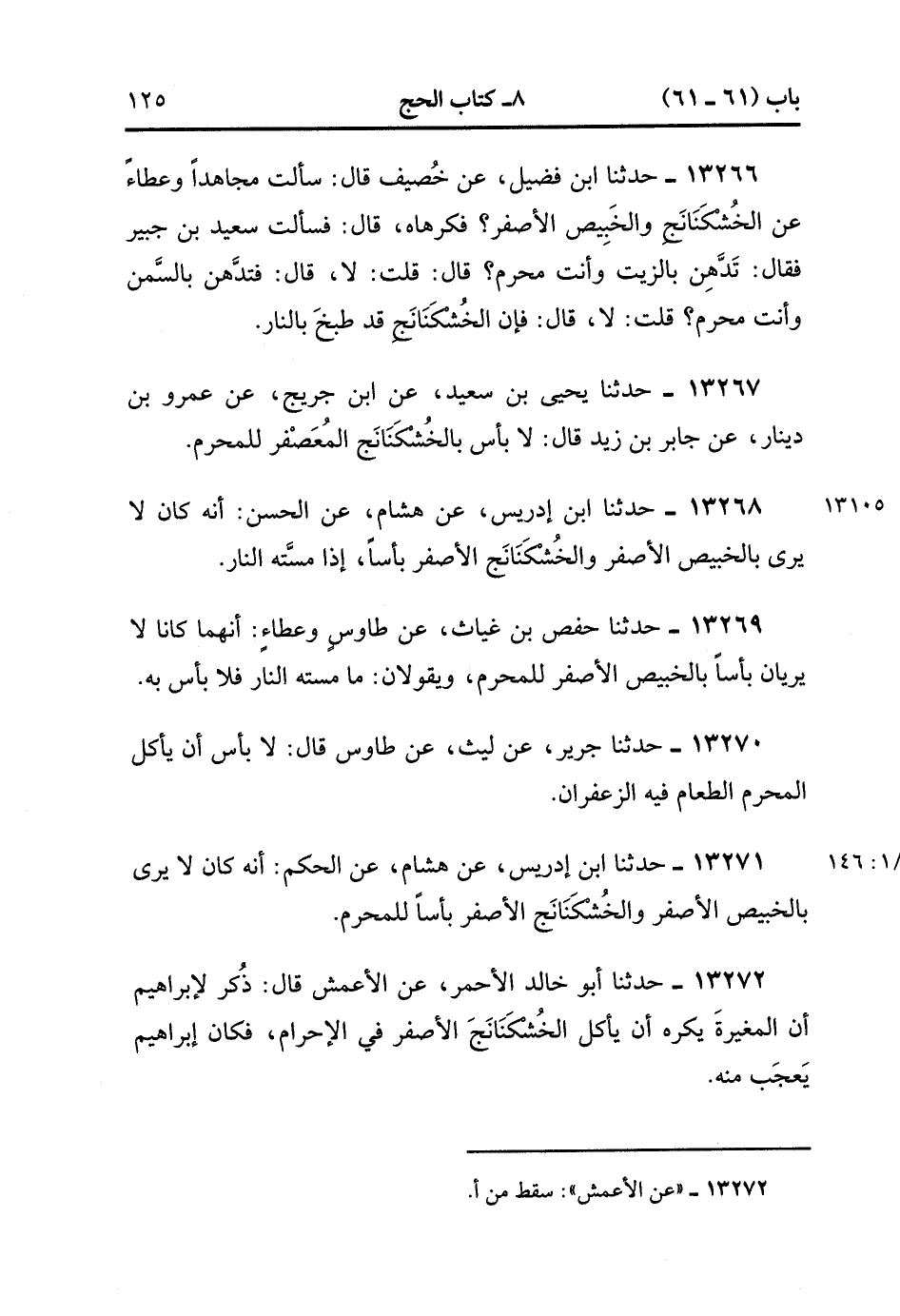 13272- حدَّثَنَا أَبُو خَالِدٍ الأَحْمَرِِ ، عَنِ الأَعْمَشِ ، قَالَ : ذُكِرَ لإِبْرَاهِيمَ أَنَّ الْمُغِيرَةَ يَكْرَهُ أَنْ يَأْكُلَ الْخُشْكَنَانَجَ الأَصْفَرَ فِي الإِحْرَامِ ، فَكَانَ إبْرَاهِيمُ يَعَجَّبَ مِنْهُ. (4/146:1).