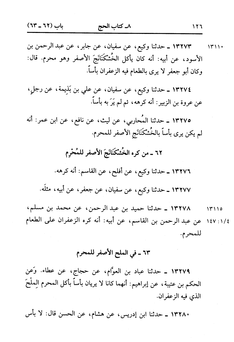 13280- حدَّثَنَا ابْنُ إِدْرِيسَ ، عَنْ هِشَامٍ ، عَنِ الْحَسَنِ ، قَالَ : لاَ بأس بالْمِلْحِ الأَصْفَرَ لِلْمُحْرِمِ. (4/147:1).
