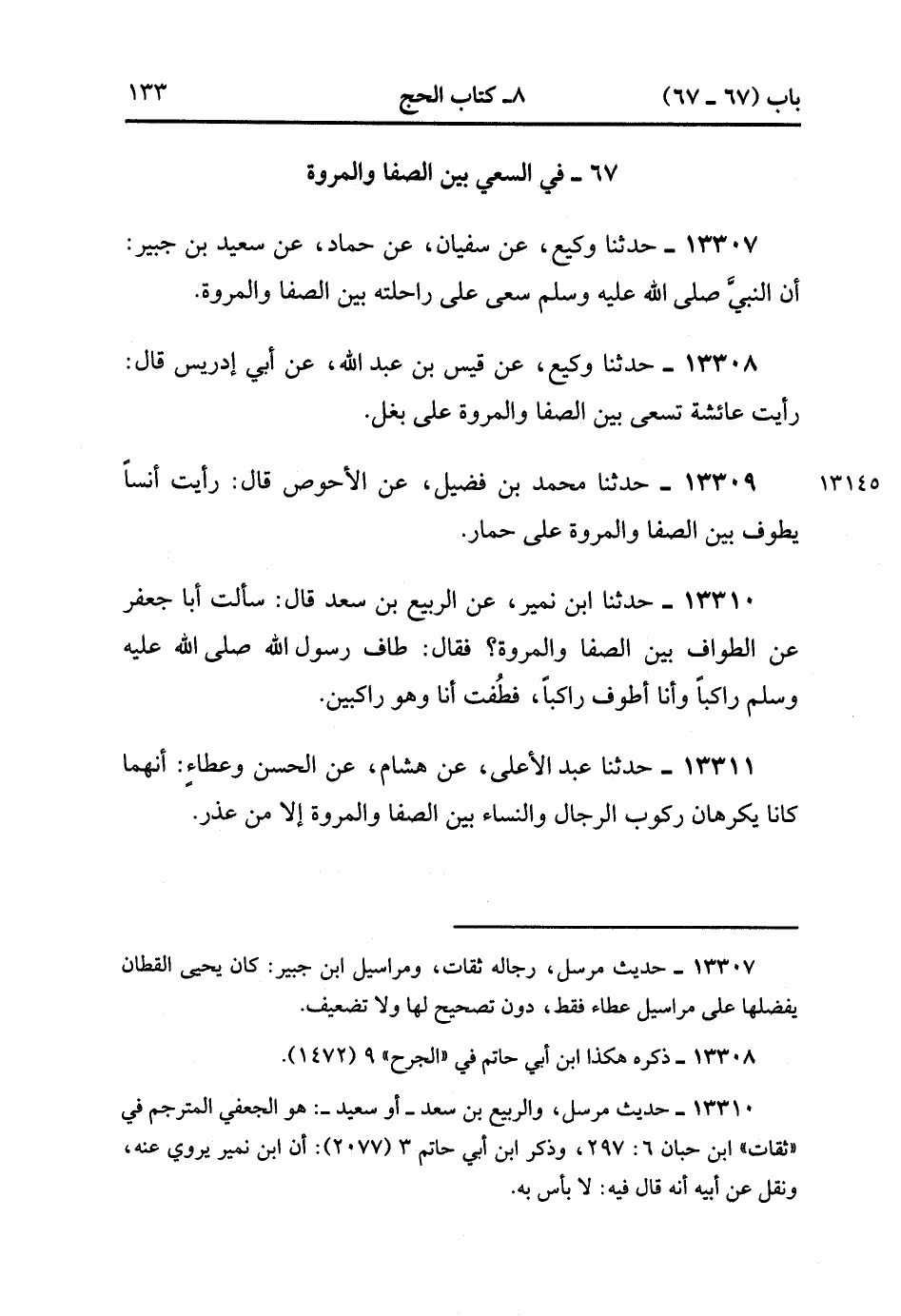 13307- حدَّثَنَا وَكِيعٌ ، عَنْ سُفْيَانَ ، عَنْ حَمَّادٍ ، عَنْ سَعِيدِ بْنِ جُبَيْرٍ ؛ أَنَّ النَّبِيَّ صَلَّى الله عَلَيْهِ وَسَلَّمَ سَعَى عَلَى رَاحِلَتِهِ بَيْنَ الصَّفَا وَالْمَرْوَةِ.