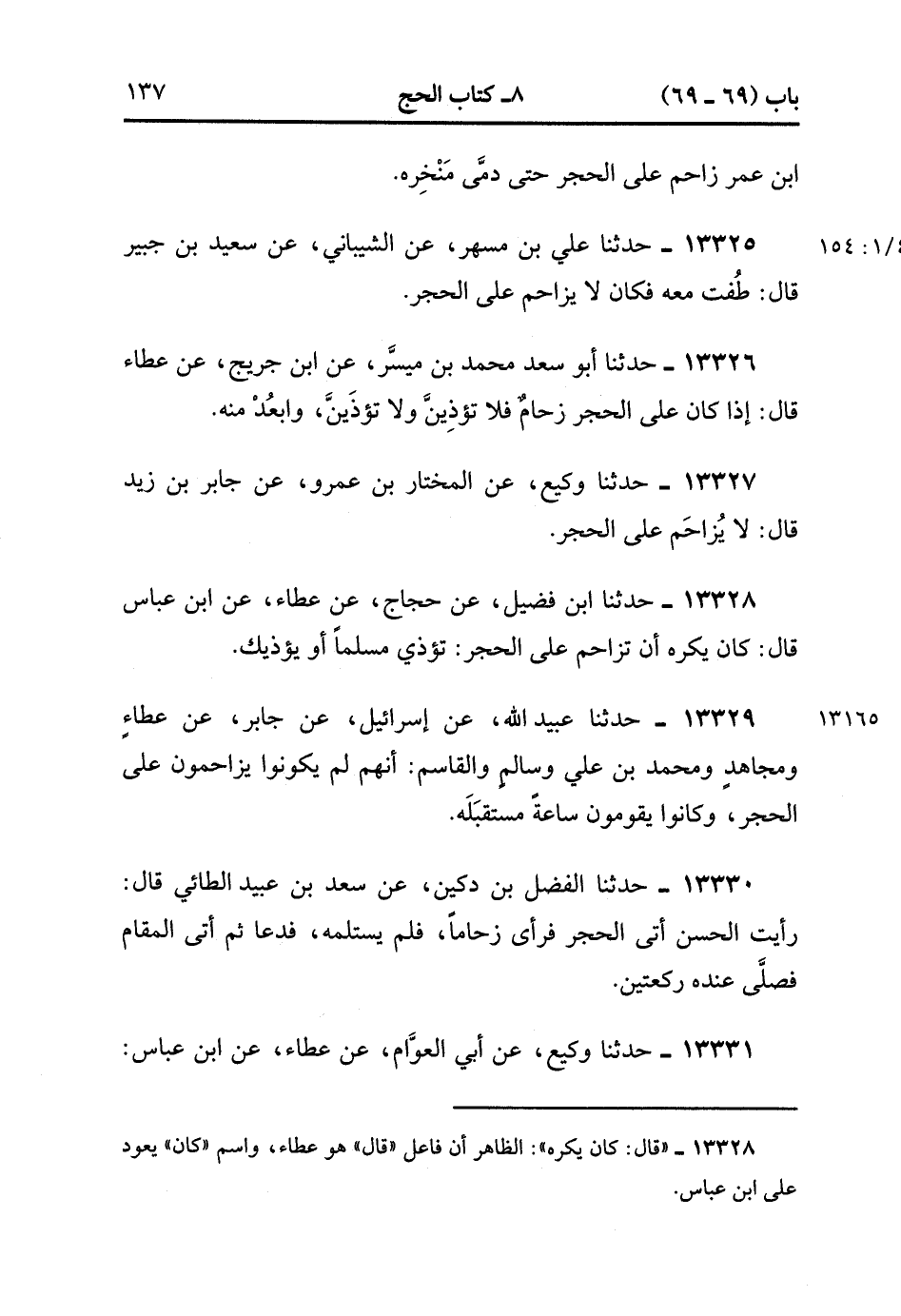 13331- حدَّثَنَا وَكِيعٌ ، عَنْ أَبِي الْعَوَّامِ ، عَنْ عَطَاءٍ ، عَنِ ابْنِ عَبَّاسٍ ؛ أَنَّهُ كَانَ يَسْتَلِمُهُ وَلاَ يُزَاحِمُ عليه ، وَكَانَ ابْنُ عُمَرَ يَفْعَلُهُ. (4/154:1).