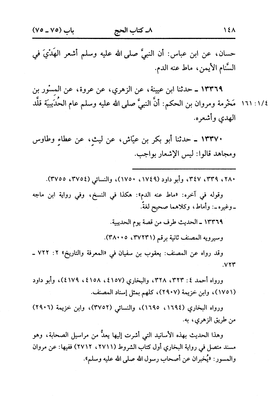 13369- حدَّثَنَا ابْنُ عُيَيْنَةَ ، عَنِ الزُّهْرِيِّ ، عَنْ عُرْوَةَ ، عَنِ الْمِسْوَرِ بْنِ مَخْرَمَةَ ، وَمَرْوَانَ بْنِ الْحَكَمِ ؛ أَنَّ النَّبِيَّ صَلَّى الله عَلَيْهِ وَسَلَّمَ عَامَ الْحُدَيْبِيَةِ قَلَّدَ الْهَدْيَ وَأَشْعَرَهُ. (4/160:1)