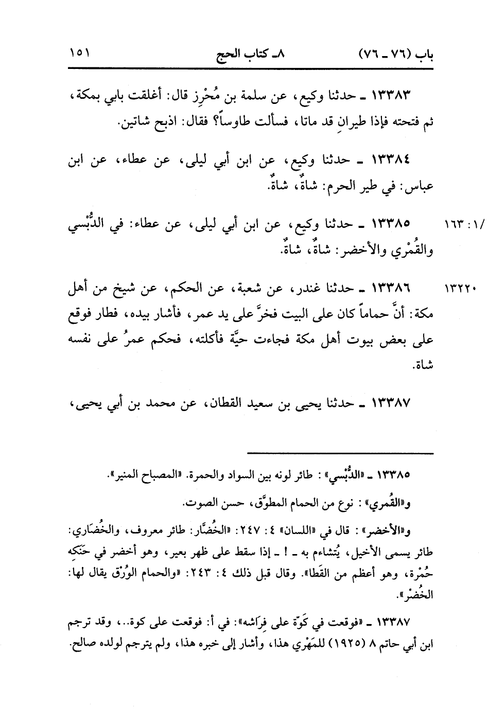 13387- حدَّثَنَا يَحْيَى بْنُ سَعِيدٍ الْقَطَّانُ ، عَنْ مُحَمَّدِ بْنِ أَبِي يَحْيَى ، عَنْ صَالِحِ بْنِ الْمَهْدِيِّ ، أَنَّ أَبَاهُ أَخْبَرَهُ ، قَالَ : حجَجْتُ مَعَ عُثْمَانَ فَقَدِمْنَا بِمَكَّةَ ، فَفَرَشْتُ لَهُ فِي بَيْتٍ فَرَقَدَ ، فَجَاءَتْ حَمَامَةٌ فَوَقَعَتْ فِي كُوَّةٍ عَلَى فِرَاشِهِ ، فَجَعَلَتْ تَبْحَثُ بِرِجْلَيْهَا ، فَخَشِيتُ أَنْ تَنْثُرَ عَلَى فِرَاشِهِ فَيَسْتَيْقِظَ ، فَأَطَرْتُهَا فَوَقَعَتْ فِي كُوَّةٍ أُخْرَى ، فَخَرَجَتْ حَيَّةٌ فَقَتَلَتْهَا ، فَلَمَّا اسْتَيْقَظَ عُثْمَانَ أَخْبَرْتُهُ ، فَقَالَ : أَدِّ عَنْكَ شَاةً ، فَقُلْتُ : إنَّمَا أَطَرْتُهَا مِنْ أَجْلِكَ ، قَالَ : وَعَنْي شَاةً. (4/163:1).