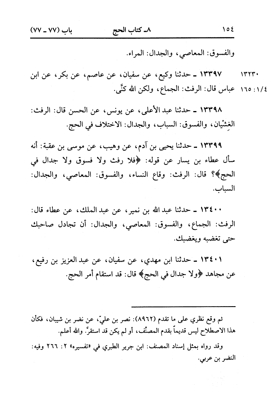 13400- حدَّثَنَا عَبْدُ اللهِ بْنُ نُمَيْرٍ ، عَنْ عَبْدِ الْمَلِكِ ، عَنْ عَطَاءٍ ، قَالَ : الرَّفَثُ : الجماع ، وَالْفُسُوقُ الْمَعَاصِي ، وَالْجِدَالُ أَنْ تُجَادِلَ صَاحِبَك حَتَّى تُغْضِبَهُ وَيُغْضِبَك.