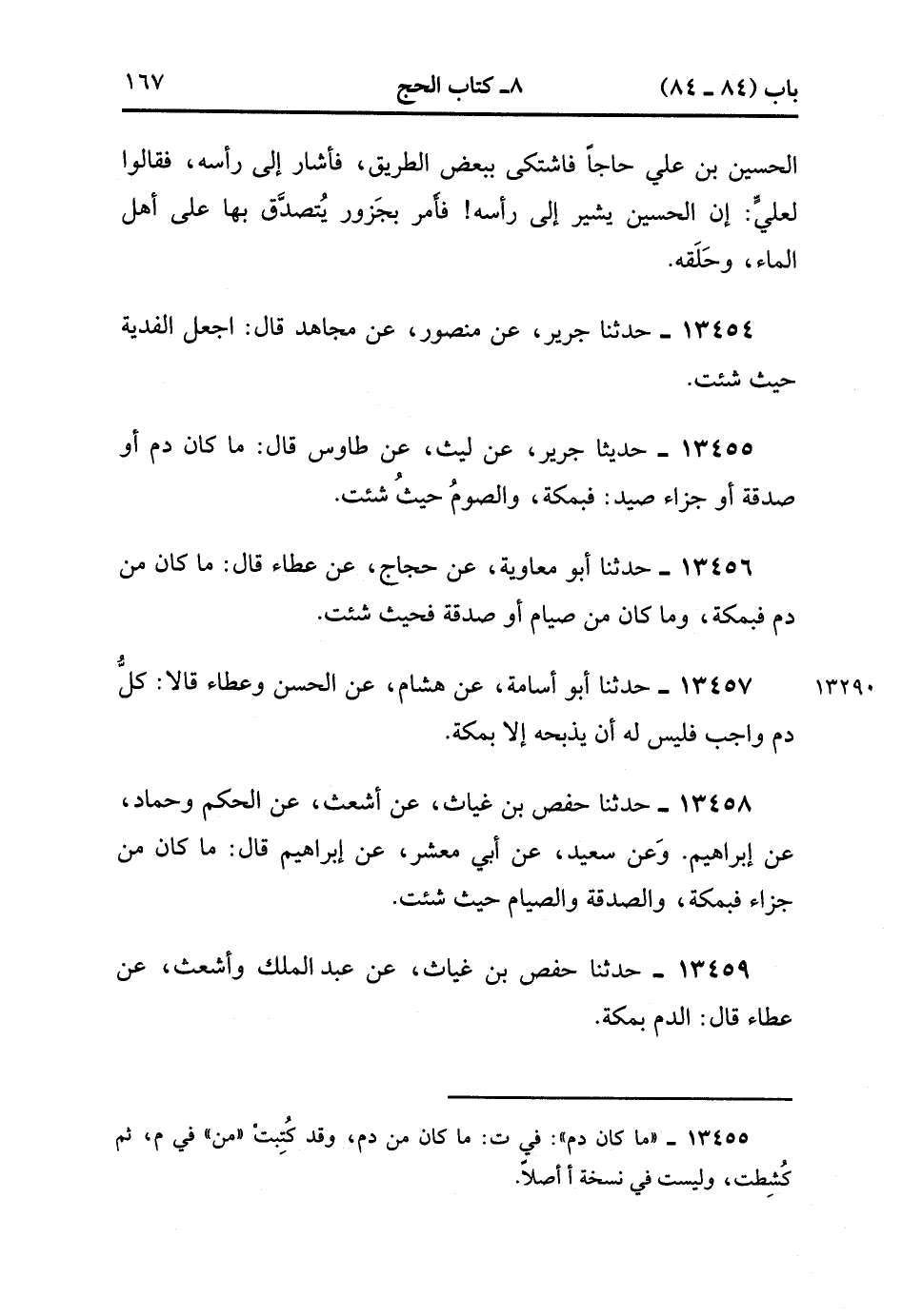 13459- حدَّثَنَا حَفْصُ بْنُ غِيَاثٍ ، عَنْ عَبْدِ الْمَلِكِ ، وَأَشْعَثَ ، عَنْ عَطَاءٍ ، قَالَ : الدَّمُ بِمَكَّةَ. (4/174:1).