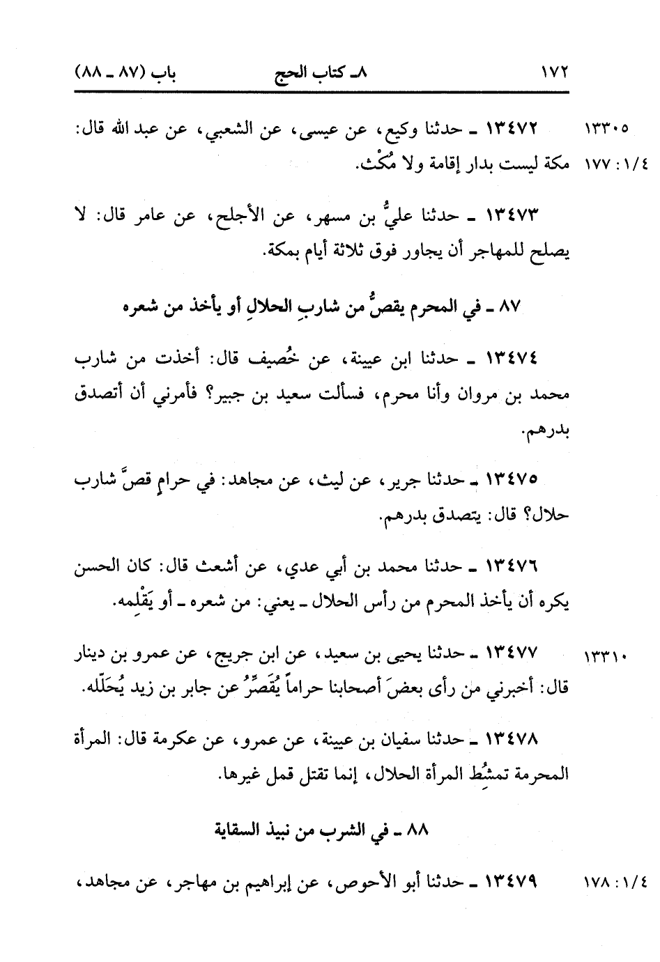 13479- حدَّثَنَا أَبُو الأَحْوَصِِ ، عَنْ إبْرَاهِيمَ بْنِ مُهَاجِرٍ ، عَنْ مُجَاهِدٍ ، عَنْ مَوْلاَهُ السَّائِبِ بْنِ عَبْدِ اللهِ ، قَالَتْ : كَانَ السَّائِبُ بْنُ عَبْدِ اللهِ يَأْمُرُنِي أَنْ أَشْرَبَ مِنْ سِقَايَةِ آلِ عَبَّاسٍ ، وَيَقُولُ : إِنَّهُ مِنْ تَمَامِ الْحَجِّ. (4/178:1).