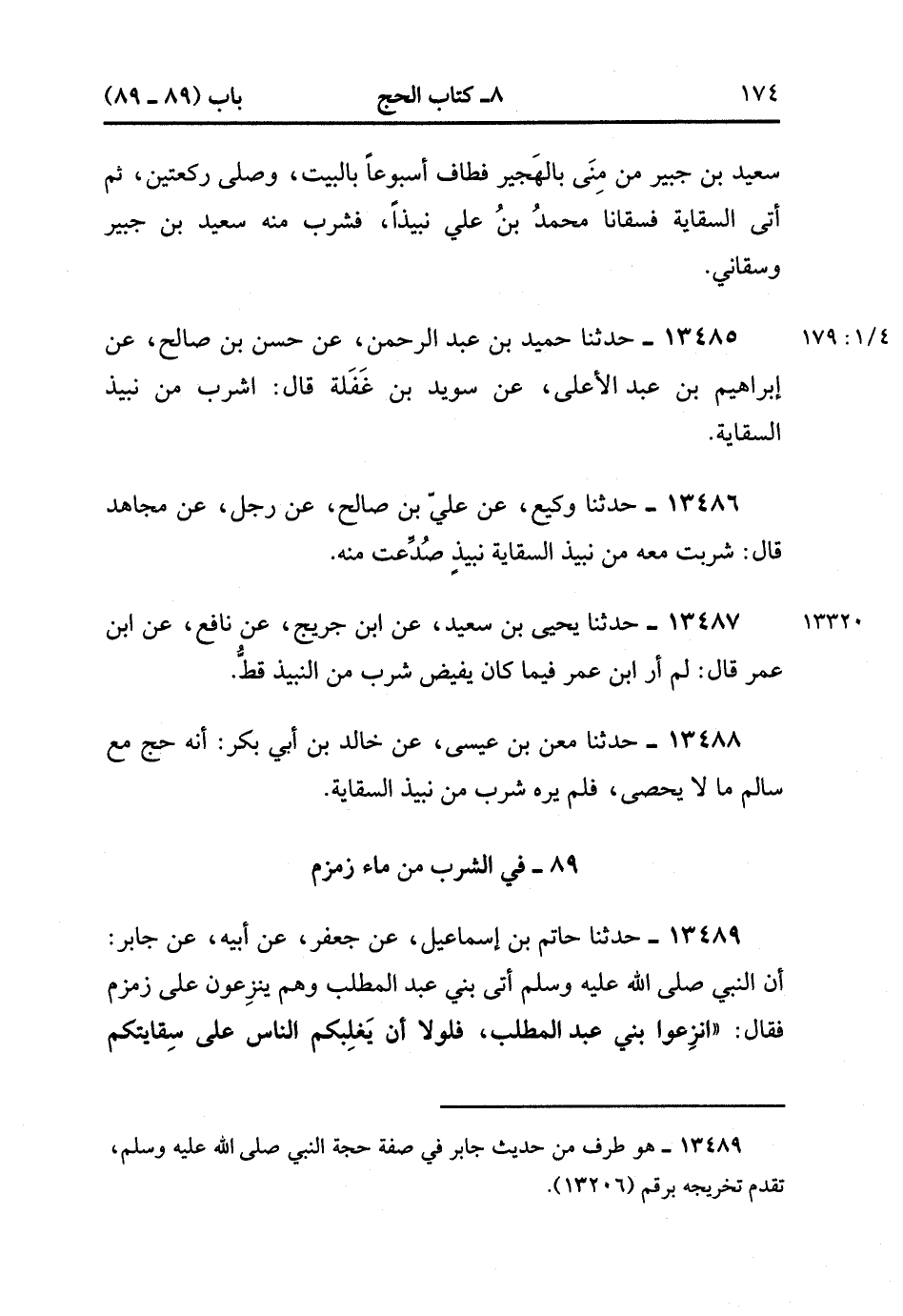 13489- حدَّثَنَا حَاتِمُ بْنُ إسْمَاعِيلَ ، عَنْ جَعْفَرٍ ، عَنْ أَبِيهِ ، عَنْ جَابِرٍ ؛ أَنَّ ألنَّبِيَّ صَلَّى الله عَلَيْهِ وَسَلَّمَ أَتَى بَنِي عَبْدِ الْمُطَّلِبِ وَهُمْ يَنْزِعُونَ عَلَى زَمْزَمَ ، فَقَالَ : انْزِعُوا بَنِي عَبْدِ الْمُطَّلِبِ ، فَلَوْلاَ أَنْ يَغْلِبَكُمُ النَّاسُ عَلَى سِقَايَتِكُمْ لَنَزَعْتُ مَعَكُمْ ، فَنَاوَلُوهُ دَلْوًا فَشَرِبَ مِنْهُ. (4/179:1).