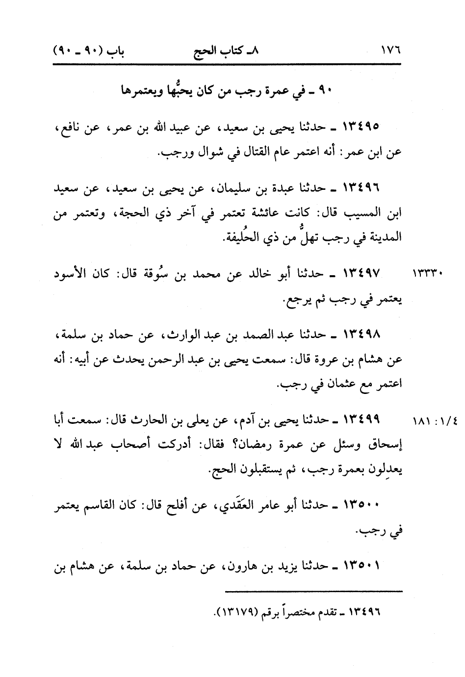 13498- حدَّثَنَا عَبْدُ الصَّمَدِ بْنُ عَبْدِ الْوَارِثِ ، عَنْ حَمَّادِ بْنِ سَلَمَةَ ، عَنْ هِشَامِ بْنِ عُرْوَةَ ، قَالَ : سَمِعْتُ يَحْيَى بْنَ عَبْدِ الرَّحْمَنِ يُحَدِّثُ ، عَنْ أَبِيهِ ؛ أَنَّهُ اعْتَمَرَ مَعَ عُثْمَانَ فِي رَجَبٍ. (4/180:1)