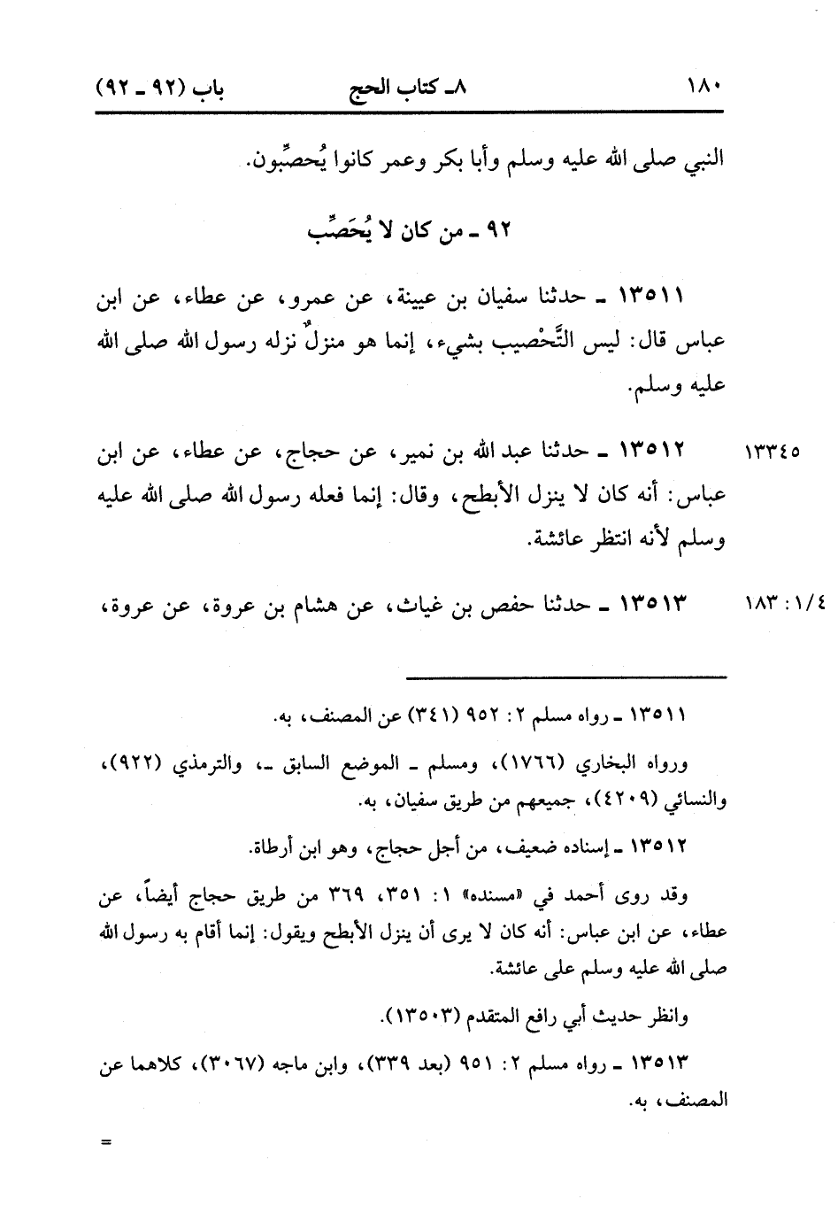 13512- حدَّثَنَا عَبْدُ اللهِ بْنُ نُمَيْرٍ ، عَنْ حَجَّاجٍ ، عَنْ عَطَاءٍ ، عَنِ ابْنِ عَبَّاسٍ ؛ أَنَّهُ كَانَ لاَ يَنْزِلُ الأَبْطَحَ ، وَقَالَ : إنَّمَا فَعَلَهُ رَسُولُ اللهِ صَلَّى الله عَلَيْهِ وَسَلَّمَ لأَنَّهُ انْتَظَرَ عَائِشَةَ. (4/182:1)
