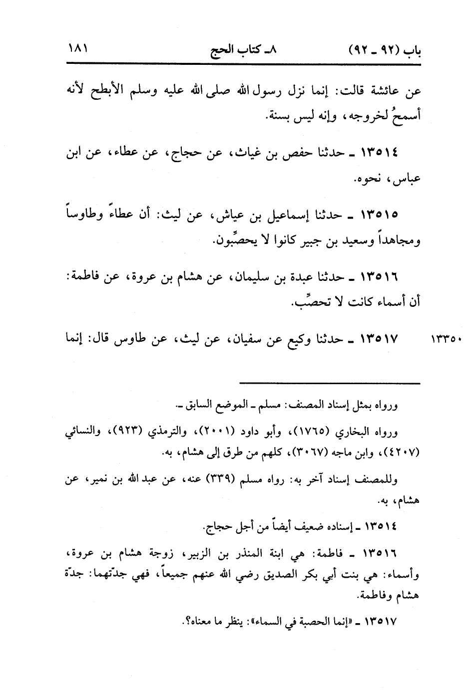 13516- حدَّثَنَا عَبْدَةُ بْنِ سُلَيْمَانَ ، عَنْ هِشَامِ بْنِ عُرْوَةَ ، عَنْ فَاطِمَةَ ؛ أَنَّ أَسْمَاءَ كَانَتْ لاَ تُحَصِّبُ.
