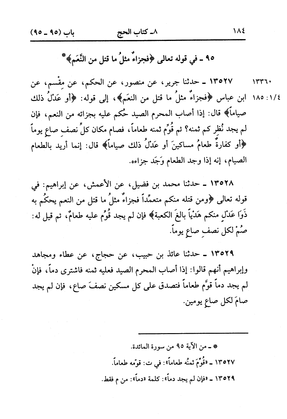 13527- حدَّثَنَا جَرِيرٌ ، عَنْ مَنْصُورٍ ، عَنِ الْحَكَمِ ، عَنْ مِقْسَمٍ ، عَنِ ابْنِ عَبَّاسٍ ؛ {فَجَزَاءٌ مِثْلُ مَا قَتَلَ مِنَ النَّعَمِ} إلَى قَوْلِهِ : {أَوْ عَدْلُ ذَلِكَ صِيَامًا} قَالَ : إذَا أَصَابَ الْمُحْرِمُ الصَّيْدَ حُكِمَ عَلَيْهِ بِجَزَائِهِ مِنَ النَّعَمِ ، فَإِنْ لَمْ يَجِدْ نَظَرَ كَمْ ثَمَنُهُ ، ثُمَّ قَوَّمَ ثَمَنَهُ طَعَامًا ، فَصَامَ مَكَانَ كُلِّ نِصْفِ صَاعٍ يَوْمًا ، {أَوْ كَفَّارَةٌ طَعَامُ مَسَاكِينَ ، أَوْ عَدْلُ ذَلِكَ صِيَامًا} قَالَ : إنَّمَا أُرِيدَ بِالطَّعَامِ الصِّيَامَ ، إِنَّهُ إذَا وَجَدَ الطَّعَامَ وَجَدَ جَزَاءَهُ. (4/184:1)