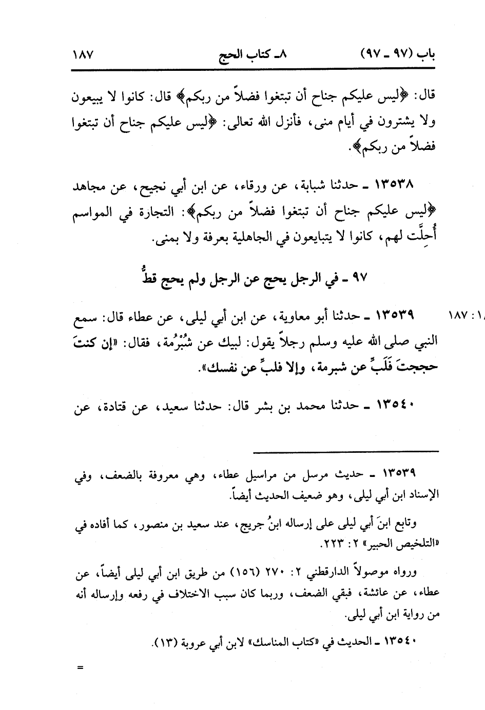 13539- حدَّثَنَا أَبُو مُعَاوِيَةَ ، عَنِ ابْنِ أَبِي لَيْلَى ، عَنْ عَطَاءٍ ، قَالَ : سَمِعَ النَّبِيُّ صَلَّى الله عَلَيْهِ وَسَلَّمَ رَجُلاً يَقُولُ : لَبَّيْكَ عَنْ شُبْرُمَةَ ، فَقَالَ : إِنْ كُنْتَ حَجَجْتَ فَلَبِّ عَنْ شُبْرُمَةَ ، وَإِلاَّ فَلَبِّ عَنْ نَفْسِكَ. (4/187:1).