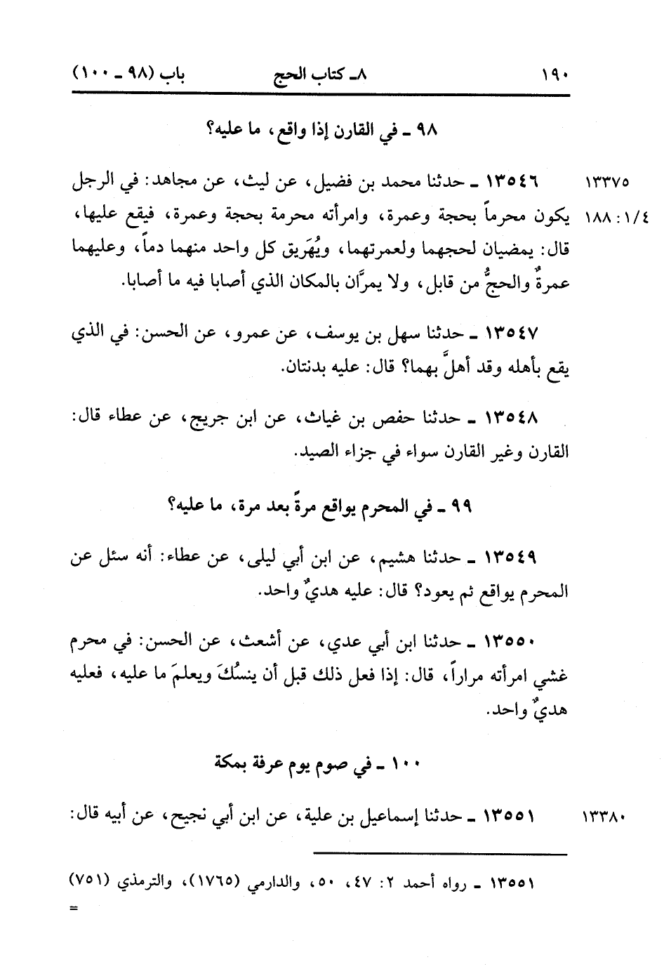 13546- حدَّثَنَا مُحَمَّدُ بْنُ فُضَيْلٍ ، عَنْ لَيْثٍ ، عَنْ مُجَاهِدٍ ؛ فِي الرَّجُلِ يَكُونُ مُحْرِمًا بِحَجَّةٍ وَعُمْرَةٍ ، وَامْرَأَتُهُ مُحْرِمَةٌ بِحَجَّةٍ وَعُمْرَةٍ فَيَقَعُ عَلَيْهَا ، قَالَ : يَمْضِيَانِ لِحَجِّهِمَا وَلِعُمْرَتِهِمَا ، وَيُهْرِيقُ كُلُّ وَاحِدٍ مِنْهُمَا دَمًا ، وَعَلَيْهِمَا عُمْرَةٌ وَالْحَجُّ مِنْ قَابِلٍ ، وَلاَ يَمُرَّانِ بِالْمَكَانِ الَّذِي أَصَابَا فِيهِ مَا أَصَابَا. (4/187:1)