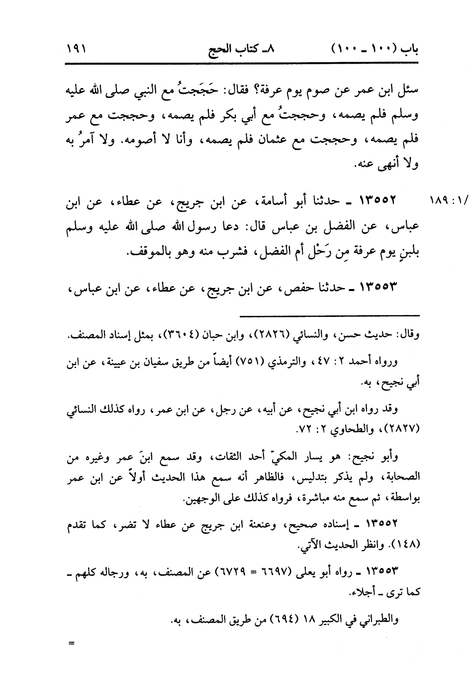 13553- حدَّثَنَا حَفْصٌ ، عَنِ ابْنِ جُرَيْجٍ ، عَنْ عَطَاءٍ ، عَنِ ابْنِ عَبَّاسٍ ، عَنِ الْفَضْلِ بْنِ عَبَّاسٍ ؛ أَنَّ النَّبِيَّ صَلَّى الله عَلَيْهِ وَسَلَّمَ شَرِبَ يَوْمَ عَرَفَةَ. (4/189:1).