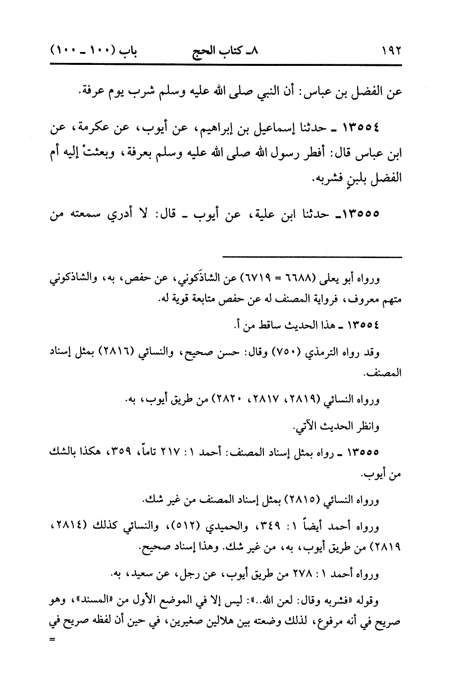 13555- حدَّثَنَا ابْنُ عُلَيَّةَ ، عَنْ أَيُّوبَ ، قَالَ : لاَ أَدْرِي سَمِعْتُهُ مِنْ سَعِيدِ بْنِ جُبَيْرٍ ، أَوْ حُدِّثْتُ عَنْهُ ، قَالَ : أَتَيْتُ عَلَى ابْنِ عَبَّاسٍ بِعَرَفَةَ وَهُوَ يَأْكُلُ رُمَّانًا ، وَقَالَ : أَفْطَرَ رَسُولُ اللهِ صَلَّى الله عَلَيْهِ وَسَلَّمَ بِعَرَفَةَ ، وَسَقَتْهُ أُمُّ الْفَضْلِ لَبَنًا فَشَرِبَهُ ، وَقَالَ : لَعَنَ اللَّهُ فُلاَنًا ، عَمَدُوا إلَى أَيَّامِ الْحَجِّ فَمَحَوْا زِينَتَهُ ، وَقَالَ : زِينَةُ الْحَجِّ التَّلْبِيَةُ. (4/189:1).