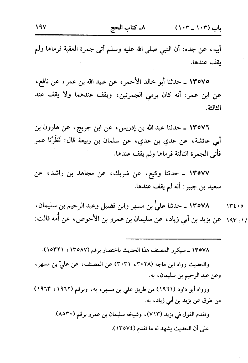 13575- حدَّثَنَا أَبُو خَالِدٍ الأَحْمَرِِ ، عَنْ عُبَيْدِ اللهِ بْنِ عُمَرَ ، عَنْ نَافِعٍ ، عَنِ ابْنِ عُمَرَ ، أَنَّهُ كَانَ يَرْمِي الْجَمْرَتَيْنِ وَيَقِفُ عِنْدَهُمَا ، وَلاَ يَقِفُ عِنْدَ الثَّالِثَةِ.