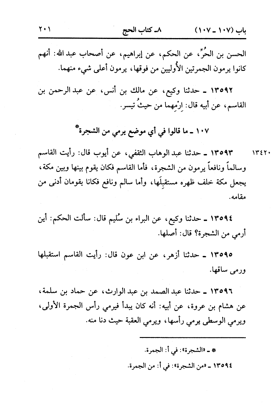 13593- حدَّثَنَا عَبْدُ الْوَهَّابِ الثَّقَفِيُّ ، عَنْ أَيُّوبَ ، قَالَ : رَأَيْتُ الْقَاسِمَ ، وَسَالِمًا ، وَنَافِعًا يَرْمُونَ مِنَ الشَّجَرَةِ ، فَأَمَّا الْقَاسِمُ فَكَانَ يَقُومُ بَيْنَهَا وَبَيْنَ مَكَّةَ ، يَجْعَلُ مَكَّةَ خَلْفَ ظَهْرِهِ مُسْتَقْبِلَهَا ، وَأَمَّا سَالِمٌ وَنَافِعٌ فَكَانَا يَقُومَانِ أَدْنَى مِنْ مَقَامِهِ.