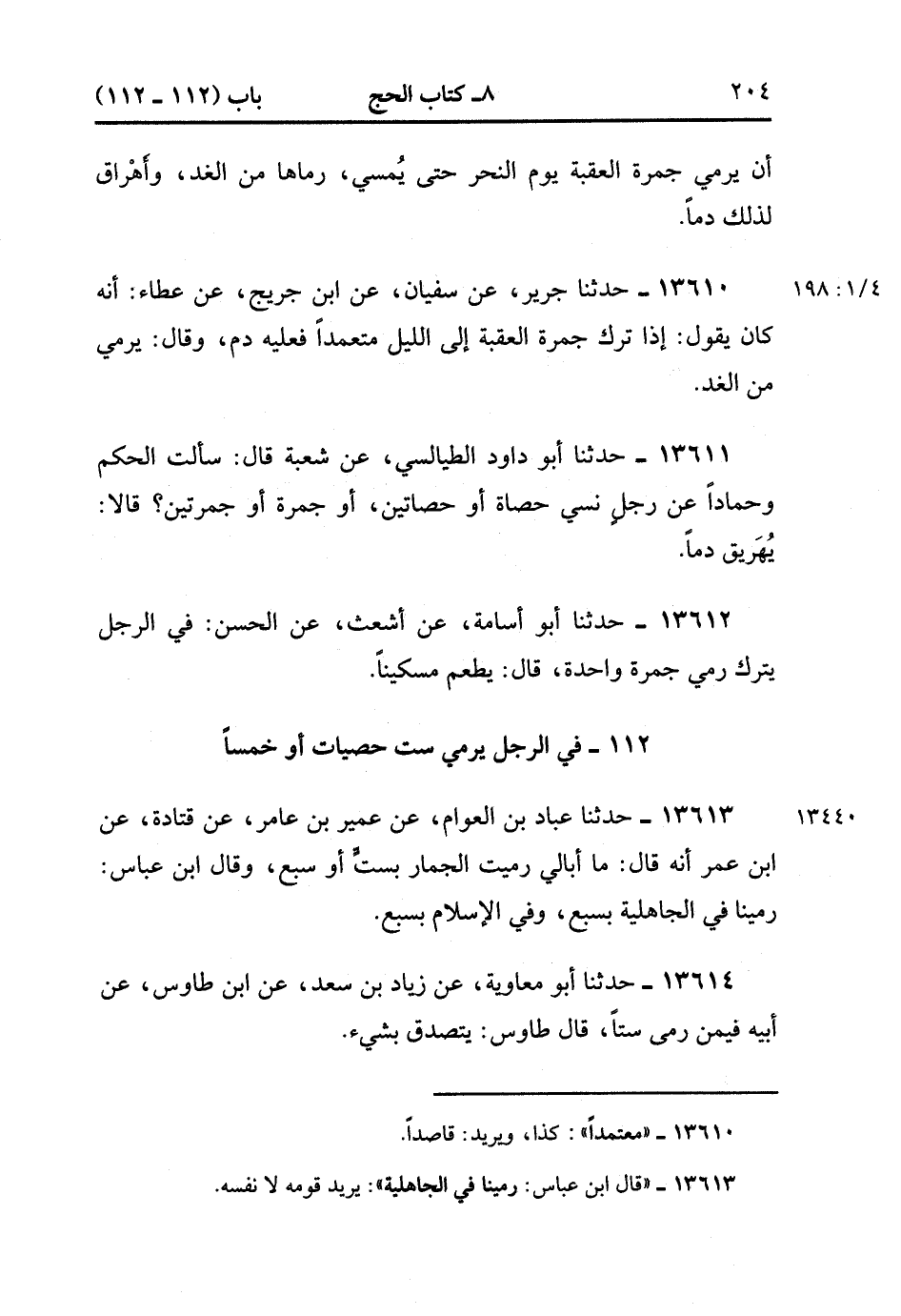 13611- حدَّثَنَا أَبُو دَاوُدَ الطَّيَالِسِيُّ ، عَنْ شُعْبَةَ ، قَالَ : سَأَلْتُ الْحَكَمَ ، وَحَمَّادًا عَنْ رَجُلٍ نَسِيَ حَصَاةً ، أَوْ حَصَاتَيْنِ ، أَوْ جَمْرَةً ، أَوْ جَمْرَتَيْنِ ؟ قَالاَ : يُهْرِيقُ دَمًا.