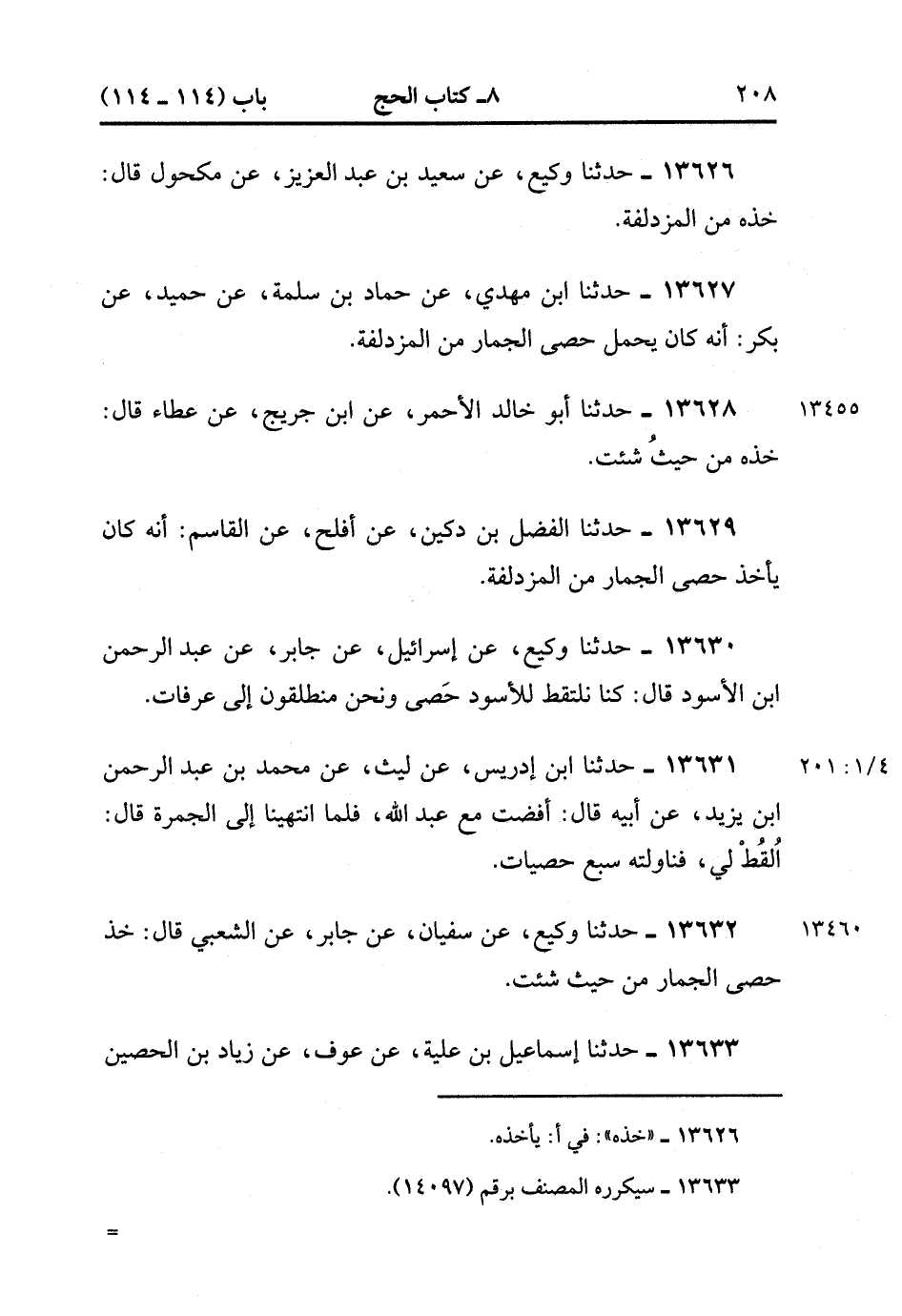 13632- حدَّثَنَا وَكِيعٌ ، عَنْ سُفْيَانَ ، عَنْ جَابِرٍ ، عَنِ الشَّعْبِيِّ ، قَالَ : خُذْ حَصَى الْجِمَارِ مِنْ حَيْثُ شِئْتَ. (4/201:1).