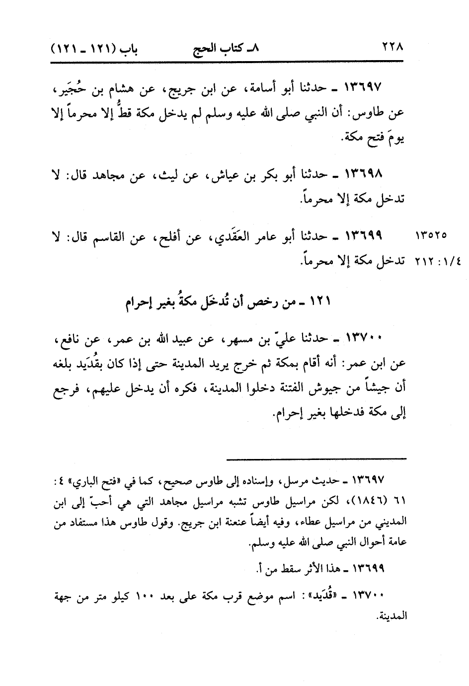 13700- حدَّثَنَا عَلِيُّ بْنُ مُسْهِرٍ ، عَنْ عُبَيْدِ اللهِ بْنِ عُمَرَ ، عَنْ نَافِعٍ ، عَنِ ابْنِ عُمَرَ ؛ أَنَّهُ أَقَامَ بِمَكَّةَ ، ثُمَّ خَرَجَ يُرِيدُ الْمَدِينَةَ ، حَتَّى إذَا كَانَ بِقَدِيدٍ بَلَغَهُ أَنَّ جَيْشًا مِنْ جُيُوشِ الْفِتْنَةِ دَخَلُوا الْمَدِينَةَ ، فَكَرِهَ أَنْ يَدْخُلَ عَلَيْهِمْ ، فَرَجَعَ إلَى مَكَّةَ فَدَخَلَهَا بِغَيْرِ إحْرَامٍ. (4/212:1).