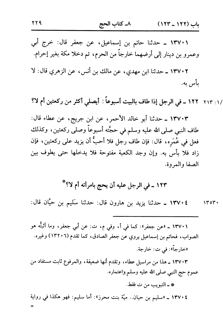 13703- حدَّثَنَا أَبُو خَالِدٍ الأَحْمَرِِ ، عَنِ ابْنِ جُرَيْجٍ ، عَنْ عَطَاءٍ ، قَالَ : طَافَ النَّبِيُّ صَلَّى الله عَلَيْهِ وَسَلَّمَ فِي حَجَّتِهِ أُسْبُوعًا وَصَلَّى رَكْعَتَيْنِ ، وَكَذَلِكَ فَعَلَ فِي عُمَرِهِ ، قَالَ : فَإِنْ طَافَ رَجُلٌ فَلاَ أُحِبَّ أَنْ يَزِيدَ عَلَى رَكْعَتَيْنِ ، فَإِنْ زَادَ فَلاَ بَأْسَ بِهِ ، وَإِنْ وَجَدَ الْكَعْبَةَ مَفْتُوحَةً فَلاَ يَدْخُلُهَا حَتَّى يَطُوفَ بَيْنَ الصَّفَا وَالْمَرْوَةِ. (4/213:1).