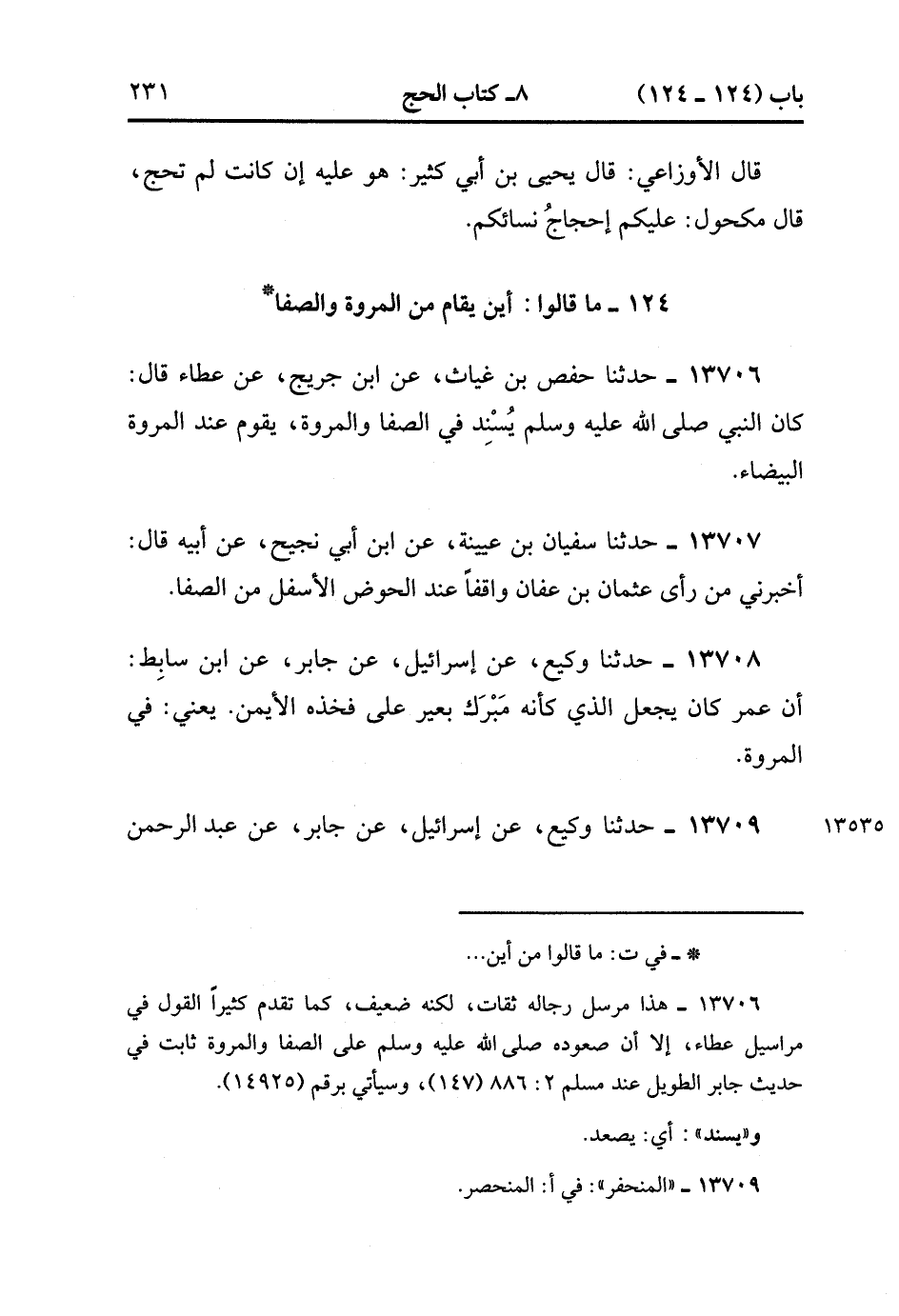 13709- حدَّثَنَا وَكِيعٌ ، عَنْ إسْرَائِيلَ ، عَنْ جَابِرِ ، عَنْ عَبْدِ الرَّحْمَنِ بْنِ الأَسْوَدِ ؛ أَنَّ أَبَاهُ كَانَ يَقُومُ عِنْدَ الْمَرْوَةِ عِنْدَ الْذي كَأَنَّهُ مَبْرَكُ بَعِيرٍ ، وَفِي الصَّفَا فِي الْمَكَانِ الْمُنْحَفِرِ. (4/213:1).