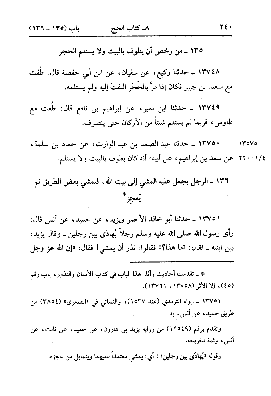 13750- حدَّثَنَا عَبْدُ الصَّمَدِ بْنُ عَبْدِ الْوَارِثِ ، عَنْ حَمَّادِ بْنِ سَلَمَةَ ، عَنْ سَعْدِ بْنِ إِبْرَاهِيمَ ، عَنْ أَبِيهِ ؛ أَنَّهُ كَانَ يَطُوفُ بِالْبَيْتِ ، وَلاَ يَسْتَلِمُ. (4/219:1)
