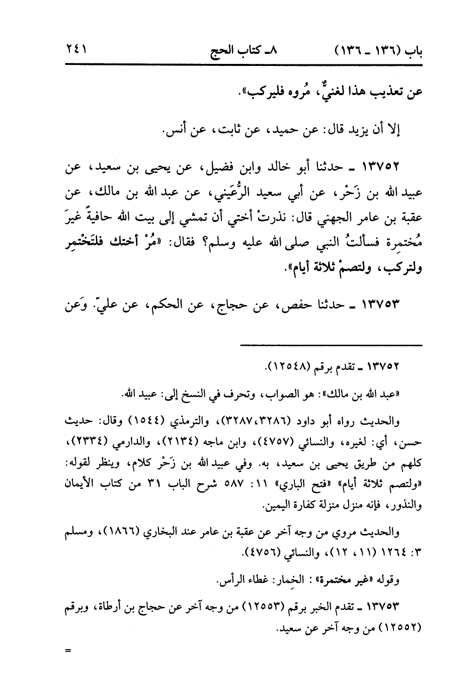 13752- حدَّثَنَا أَبُو خَالِدٍ ، وَابْنُ فُضَيْلٍ ، عَنْ يَحْيَى بْنِ سَعِيدٍ ، عَنْ عُبَيْدِ اللهِ بْنِ زَحْرٍ ، عَنْ أَبِي سَعِيدٍ الرُّعَيْنِيِّ ، عَنْ عَبْدِ اللهِ بْنِ مَالِكٍ ، عَنْ عُقْبَةَ بْنِ عَامِرٍ الْجُهَنِيِّ ، قَالَ : نَذَرَتْ أُخْتِي أَنْ تَمْشِيَ إلَى بَيْتِ اللهِ حَافِيَةً غَيْرَ مُخْتَمِرَةٍ ، فَسَأَلْتُ النَّبِيَّ صَلَّى الله عَلَيْهِ وَسَلَّمَ ؟ فَقَالَ : مُرْ أُخْتَكَ فَلْتَخْتَمِرْ وَلْتَرْكَبْ ، وَلْتَصُمْ ثَلاَثَةَ أَيَّامٍ.