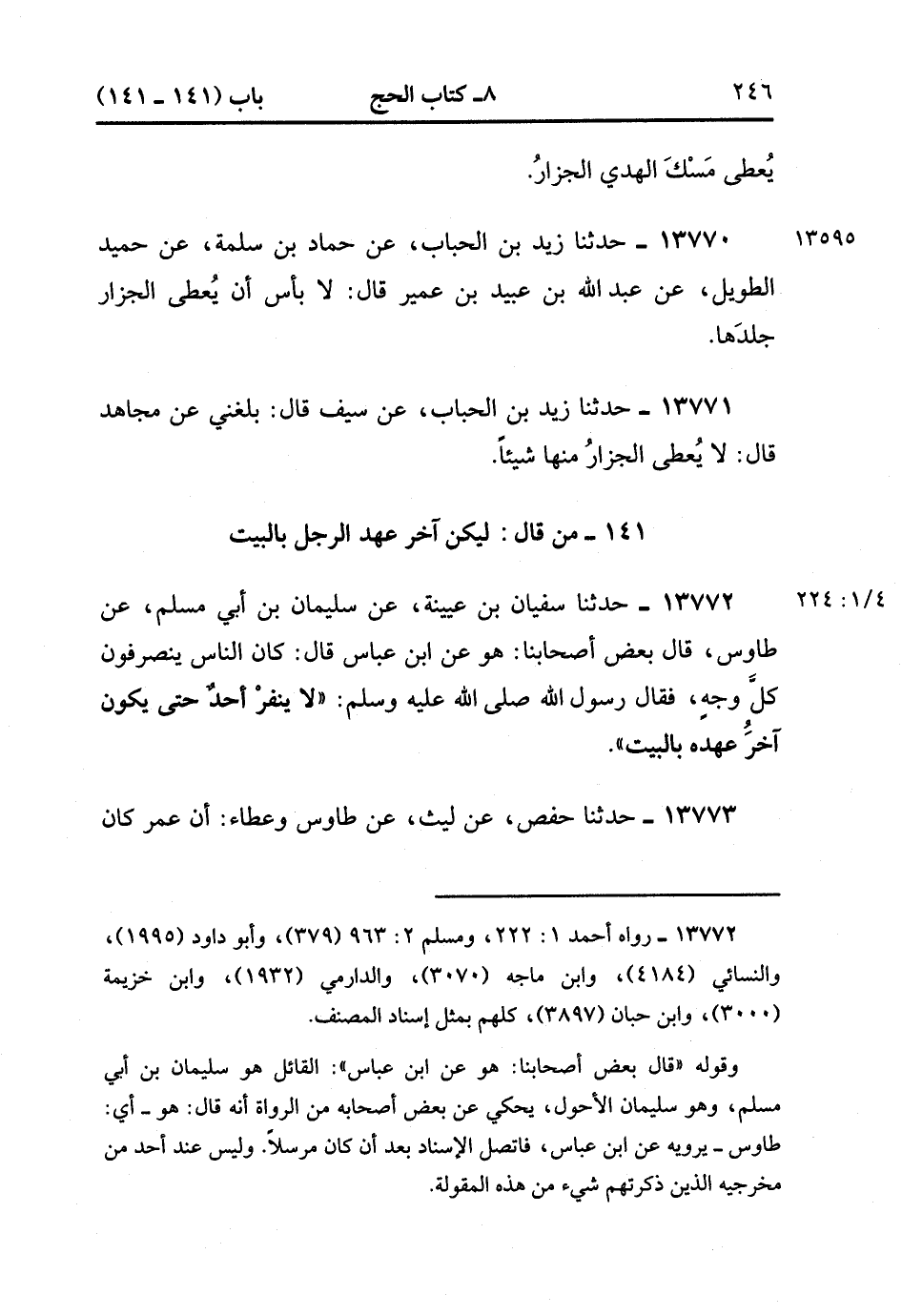 13773- حدَّثَنَا حَفْصٌ ، عَنْ لَيْثٍ ، عَنْ طَاوُوس ، وَعَطَاءٍ ؛ أَنَّ عُمَرَ كَانَ يَرُدُّ مَنْ خَرَجَ ، وَلَمْ يَكُنْ آخِرَ عَهْدِهِ بِالْبَيْتِ. (4/224:1).