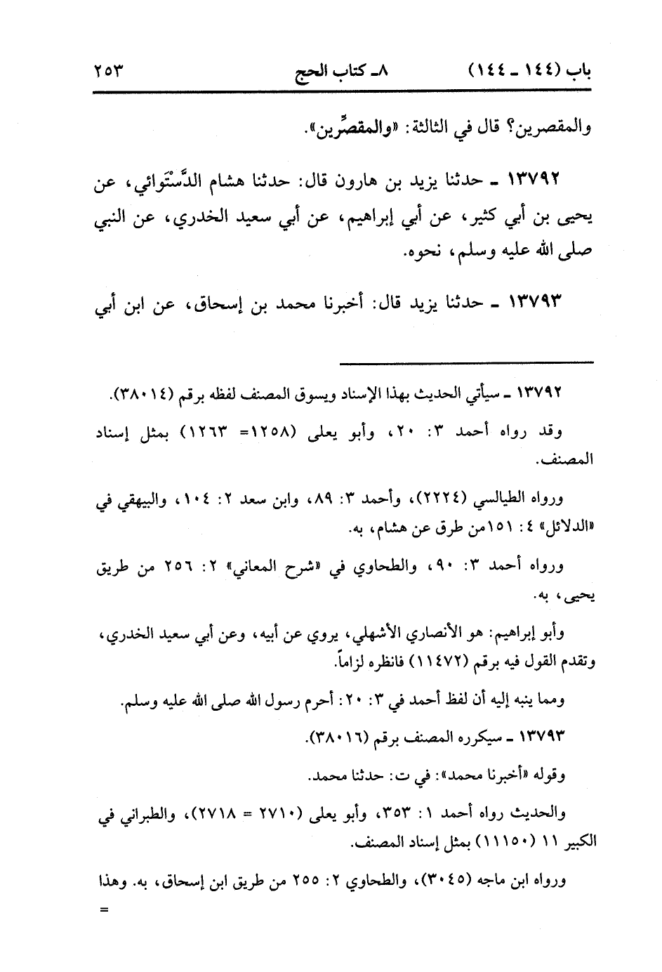 13793- حدَّثَنَا يَزِيدُ , قَالَ : أَخْبَرَنَا مُحَمَّدُ بْنُ إِسْحَاقَ ، عَنِ ابْنِ أَبِي نَجِيحٍ ، عَنْ مُجَاهِدٍ ، عَنِ ابْنِ عَبَّاسٍ ، قَالَ : قَالَ رَسُولُ اللهِ صَلَّى الله عَلَيْهِ وَسَلَّمَ : اللَّهُمَّ اغْفِرْ لِلْمُحَلِّقِينَ ، قَالَهَا ثَلاَثًا ، قَالَ : فَقَالُوا : يَا رَسُولَ اللهِ ، مَا بَالُ الْمُحَلِّقِينَ ظَاهَرْتَ لَهُمُ التَّرَحُّمَ ؟ قَالَ : إِنَّهُمْ لَمْ يَشُكُّوا. (4/227:1).