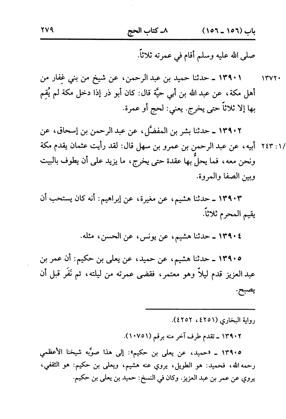 13905- حدَّثَنَا هُشَيْمٌ ، عَنْ حُمَيْدِ ، عَنْ يَعْلَى بْنِ حَكِيمٍ ؛ أَنَّ عُمَرَ بْنَ عَبْدِ الْعَزِيزِ قَدِمَ لَيْلاً وَهُوَ مُعْتَمِرٌ ، فَقَضَى عُمْرَتَهُ مِنْ لَيْلَتِهِ ، ثُمَّ نَفَرَ قَبْلَ أَنْ يُصْبِحَ. (4/243:1).