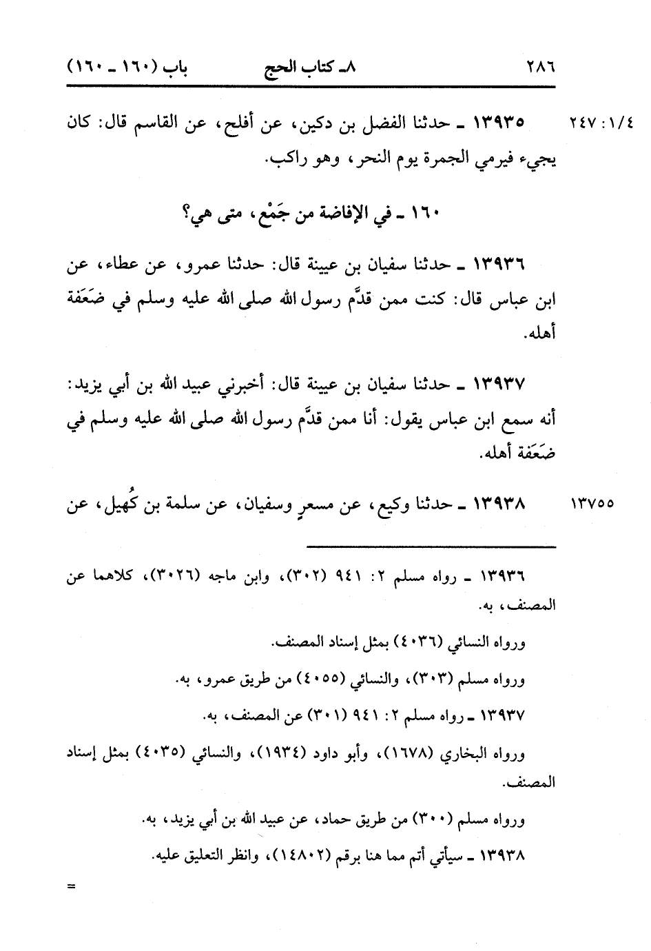 13937- حدَّثَنَا سُفْيَانُ بْنُ عُيَيْنَةَ , قَالَ : أَخْبَرَنَا عُبَيْدُ اللهِ بْنُ أَبِي يَزِيدَ ؛ أَنَّهُ سَمِعَ ابْنَ عَبَّاسٍ يَقُولُ : أَنَا مِمَّنْ قَدَّمَ رَسُولُ اللهِ صَلَّى الله عَلَيْهِ وَسَلَّمَ فِي ضَعَفَةِ أَهْلِهِ. (4/247:1).