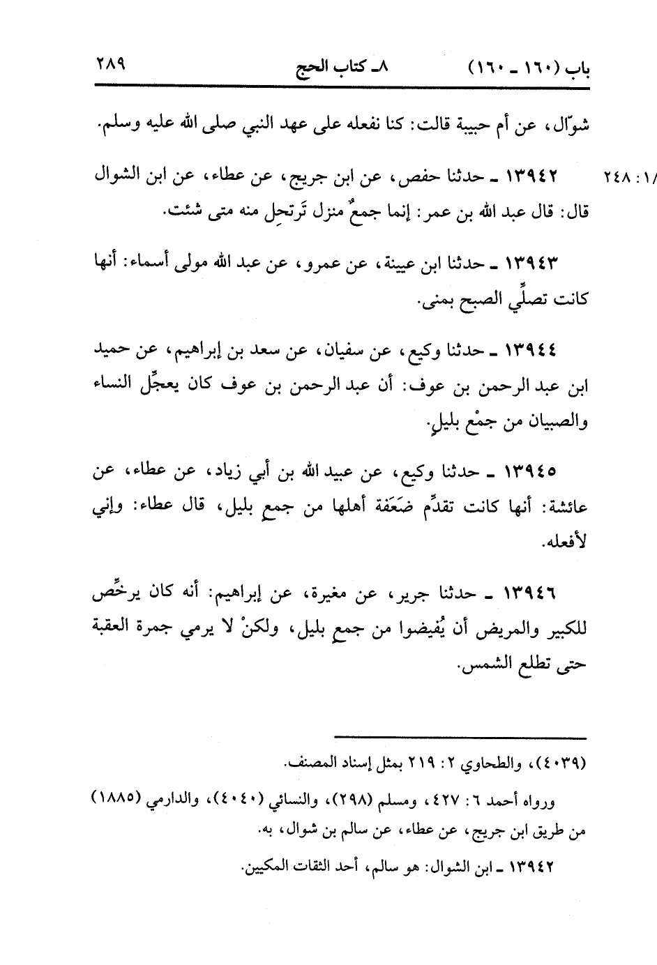 13946- حدَّثَنَا جَرِيرٌ ، عَنْ مُغِيرَةَ ، عَنْ إبْرَاهِيمَ ؛ أَنَّهُ كَانَ يُرَخِّصُ لِلْكَبِيرِ وَالْمَرِيضِ أَنْ يُفِيضُوا مِنْ جَمْعٍ بِلَيْلٍ ، وَلَكِنْ لاَ يَرْمِي جَمْرَةَ الْعَقَبَةِ حَتَّى تَطْلُعَ الشَّمْسُ. (4/248:1).