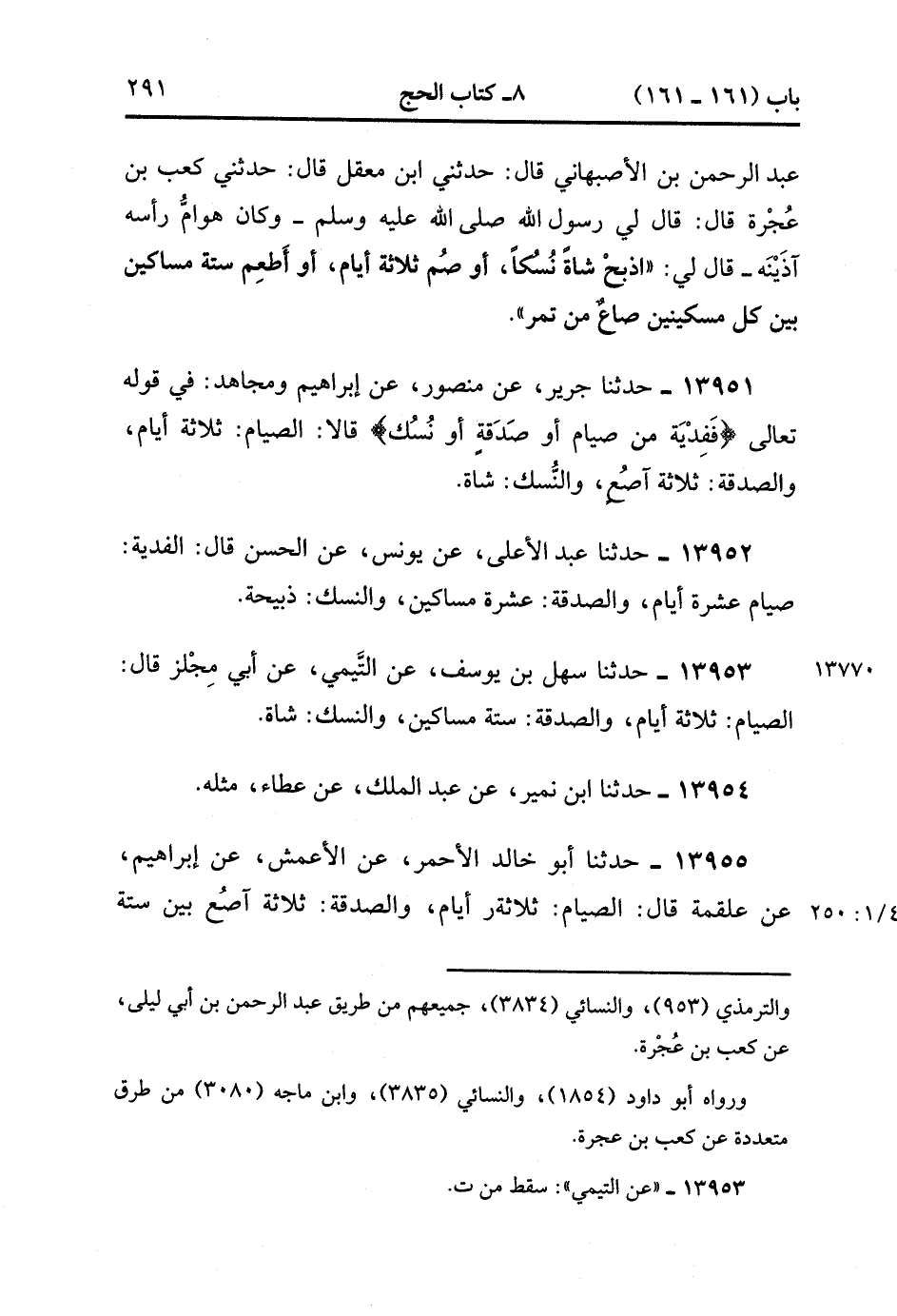 13955- حدَّثَنَا أَبُو خَالِدٍ الأَحْمَرِِ ، عَنِ الأَعْمَشِ ، عَنْ إِبْرَاهِيمَ ، عَنْ عَلْقَمَةَ ، قَالَ : الصِّيَامُ ثَلاَثَةُ أَيَّامٍ ، وَالصَّدَقَةُ ثَلاَثَةُ آصُعٍ بَيْنَ سِتَّةِ مَسَاكِينَ ، وَالنُّسُكُ شَاةٌ. (4/249:1).