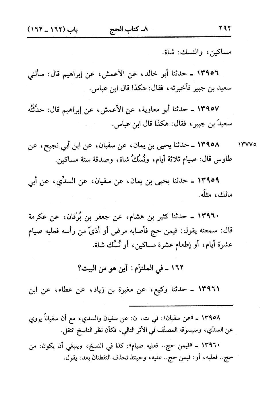 13958- حدَّثَنَا يَحْيَى بْنُ يَمَانٍ ، عَنْ سُفْيَانَ ، عَنِ ابْنِ أَبِي نَجِيحٍ ، عَنْ طَاوُوسٍ ، قَالَ : صِيَامٌ ثَلاَثَةُ أَيَّامٍ ، وَنُسُكٌ شَاةٌ ، وَصَدَقَةٌ سِتَّةُ مَسَاكِينَ.