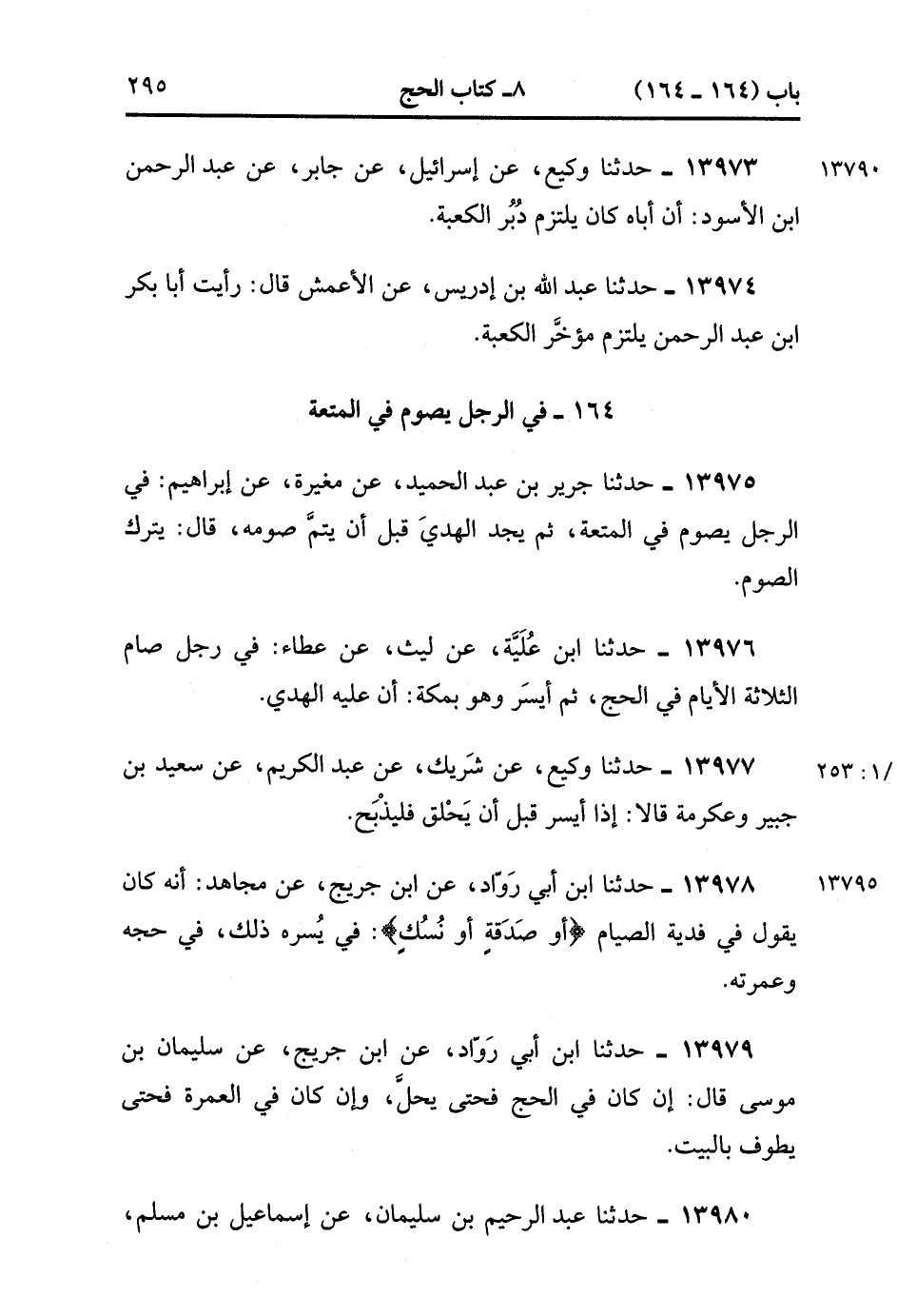 13974- حدَّثَنَا عَبْدُ اللهِ بْنُ إدْرِيسَ ، عَنِ الأَعْمَشِ ، قَالَ : رَأَيْتُ أَبَا بَكْرِ بْنَ عَبْدِ الرَّحْمَنِ يَلْتَزِمُ مُؤَخِّرَ الْكَعْبَةِ.