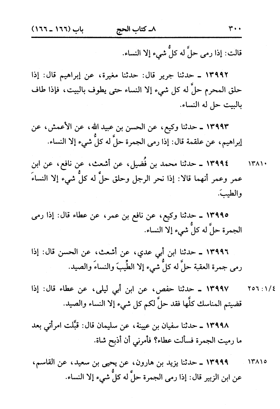13999- حدَّثَنَا يَزِيدُ بْنُ هَارُونَ ، عَنْ يَحْيَى بْنِ سَعِيدٍ ، عَنِ الْقَاسِمِ ، عَنِ ابْنِ الزُّبَيْرِ ، قَالَ : إذَا رَمَى الْجَمْرَةَ حَلَّ لَهُ كُلُّ شَيْءٍ ، إِلاَّ النِّسَاءَ. (4/256:1).