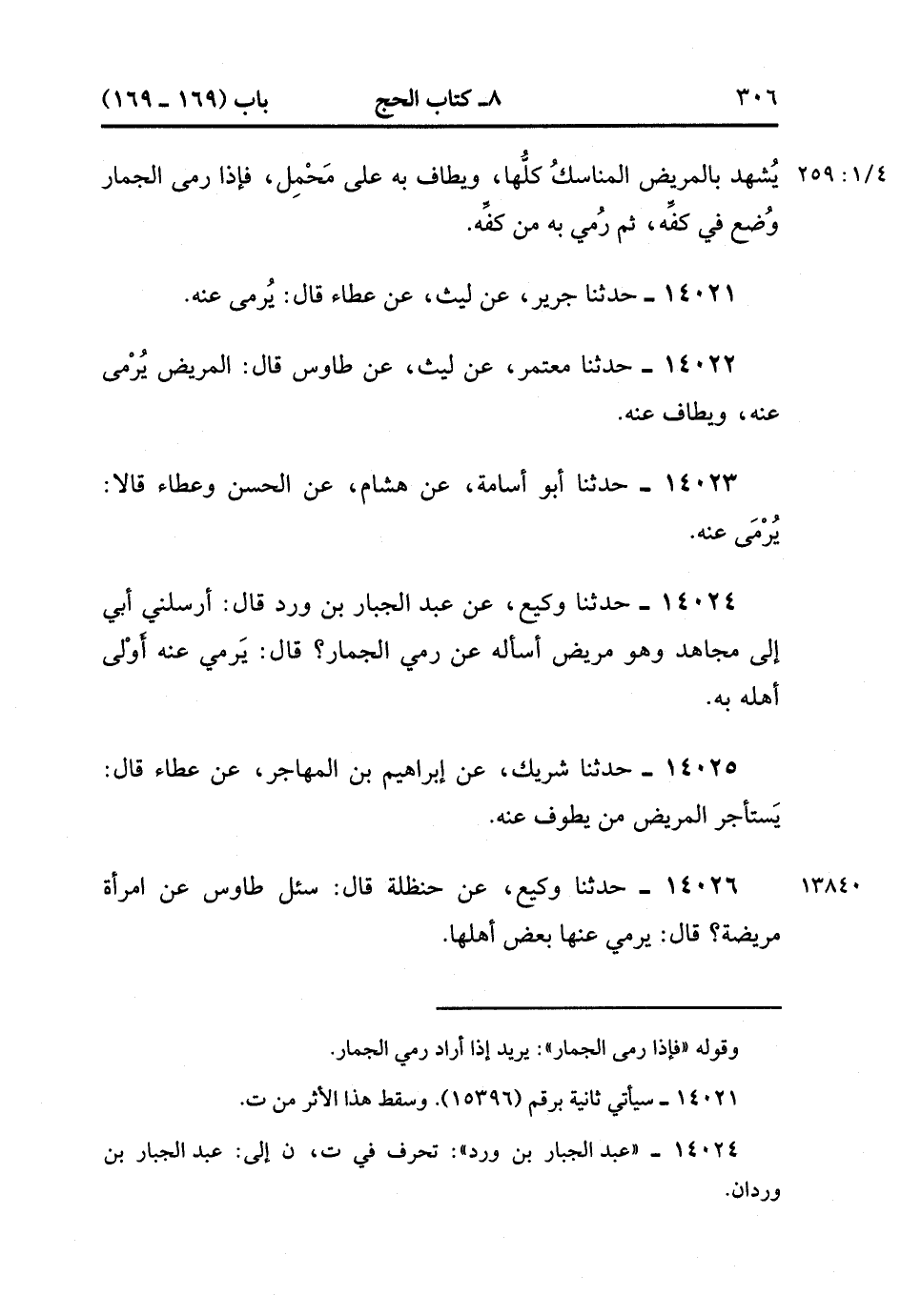 14024- حدَّثَنَا وَكِيعٌ ، عَنْ عَبْدِ الْجَبَّارِ بْنِ وَرْدٍ ، قَالَ : أَرْسَلَنِي أَبِي إلَى مُجَاهِدٍ وَهُوَ مَرِيضٌ أَسْأَلُهُ عَنْ رَمْيِ الْجِمَارِ ؟ قَالَ : يَرْمِي عَنه أَوْلَى أَهْلِهِ بِهِ.